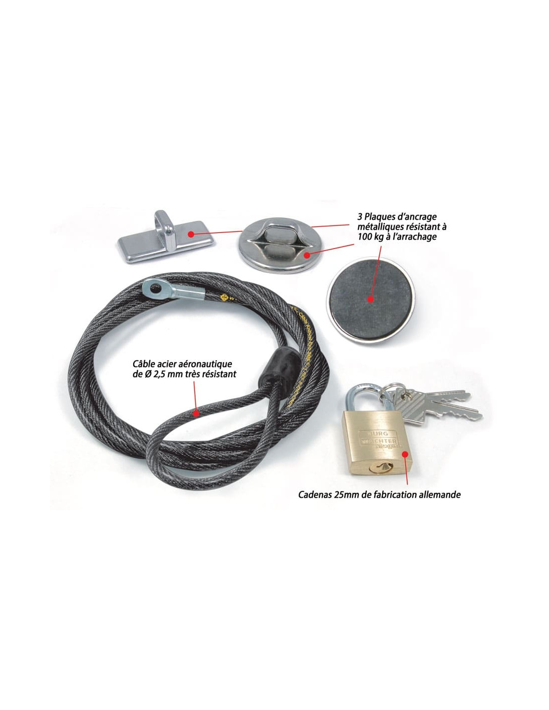 This computer locking system with computer security cable is available either in the form of a ready to use individual kit (specially recommended if the user performs the installation), or is sold per unit, that allows you to accurately adjust the anchoring system in a way that best suits your needs.