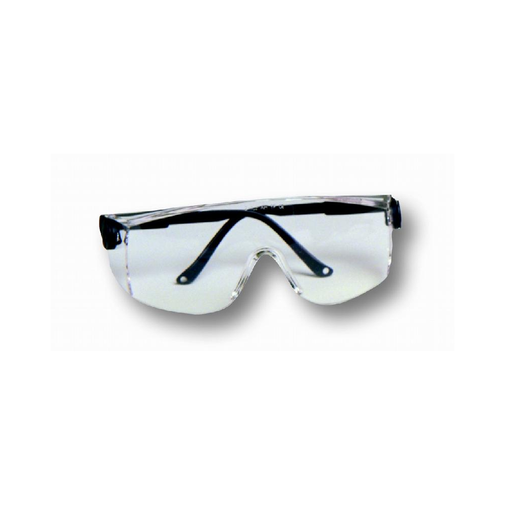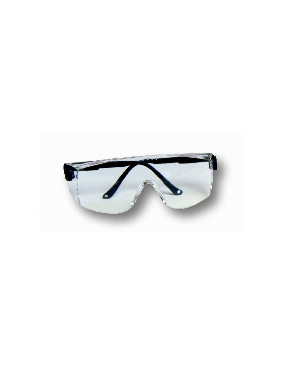 Protective goggles with polycarbonate lens and adjustable temples in black. High quality, impact resistant lens, compatible with prescription glasses. Optical Class 1.