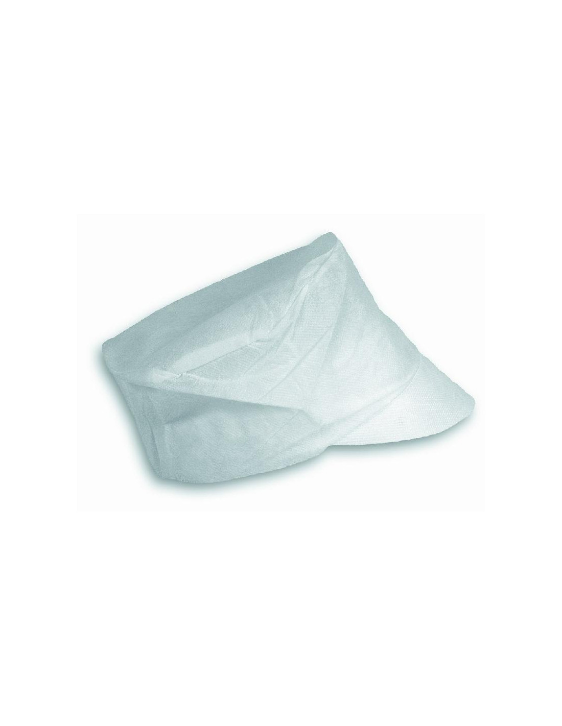 Unisex white cap in non-woven PLP fabric. One size fits all, this cap is elastic at the neck. Ideal for the food sector. Box of 500 pcs