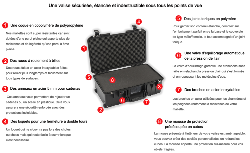All our transport cases are carefully designed to protect your most fragile items during risky travels. Each secure case is waterproof, equipped with an advanced locking system, and features a foam-lined interior to ensure maximum protection during transport.