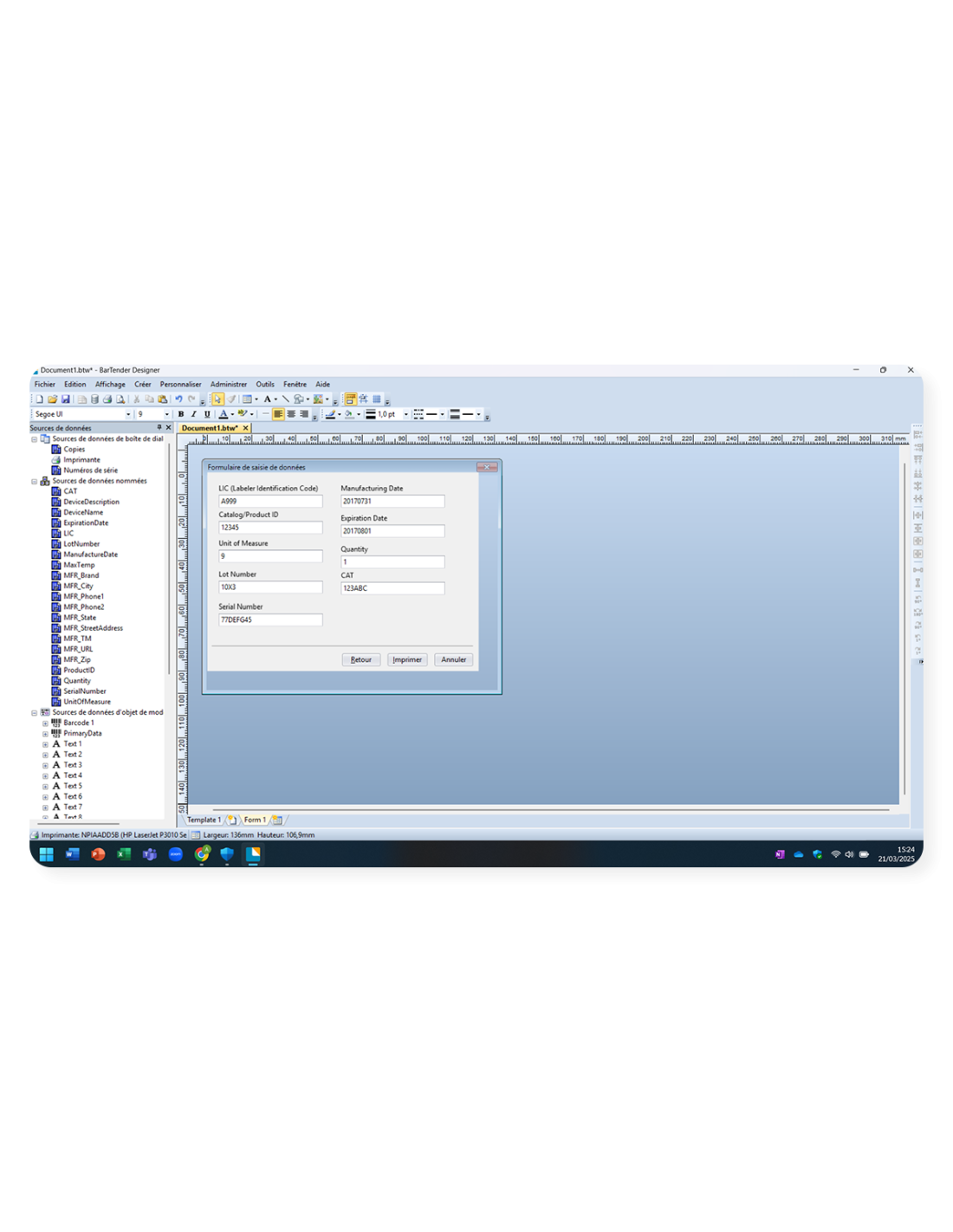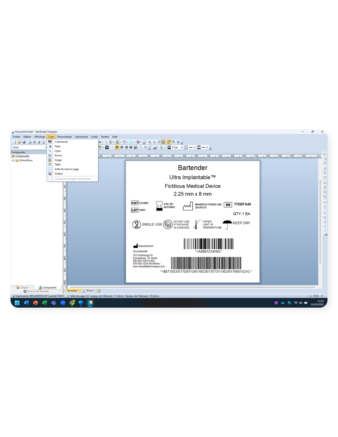 Create your labels in just a few clicks by adding your logo, text, frames, and barcodes (static or variable). The software is compatible with Word and Excel and includes a database for simplified management.