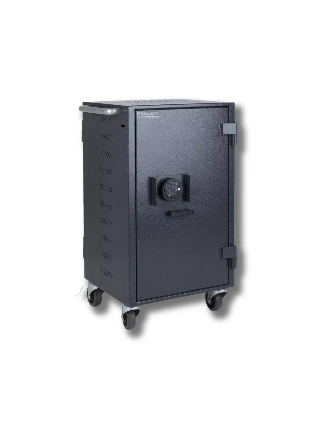 The XS model, with its solid front and rear doors, offers efficient and secure laptop organization. Laptop power adapters are stored in adapter bags located behind the rear door, making them easy to access and recharge. The locking system, available with a high-security key or an advanced code lock, enhances the safety of stored equipment, providing peace of mind for teachers and students.