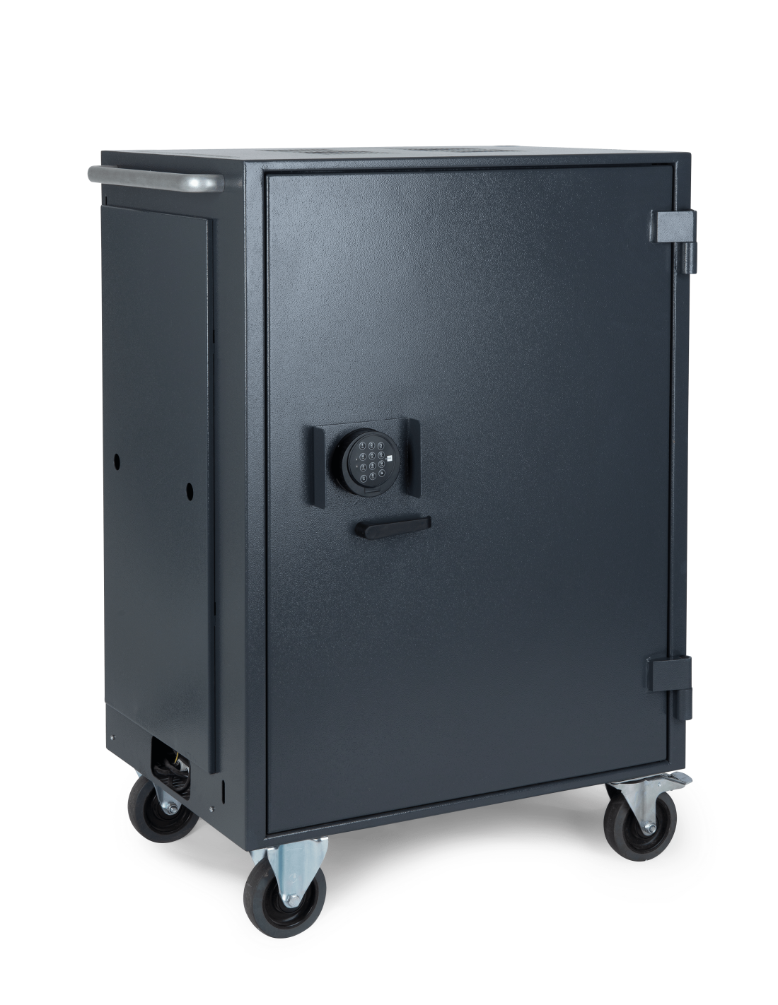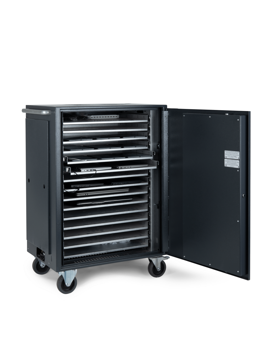 The Fort Knox Draw model, equipped with multiple drawers, allows for efficient organization of laptops or tablets. Each drawer, designed to hold one laptop or tablet, is fitted with an integrated charging system. This simplifies the charging process by reducing the need for multiple power strips and extension cords.