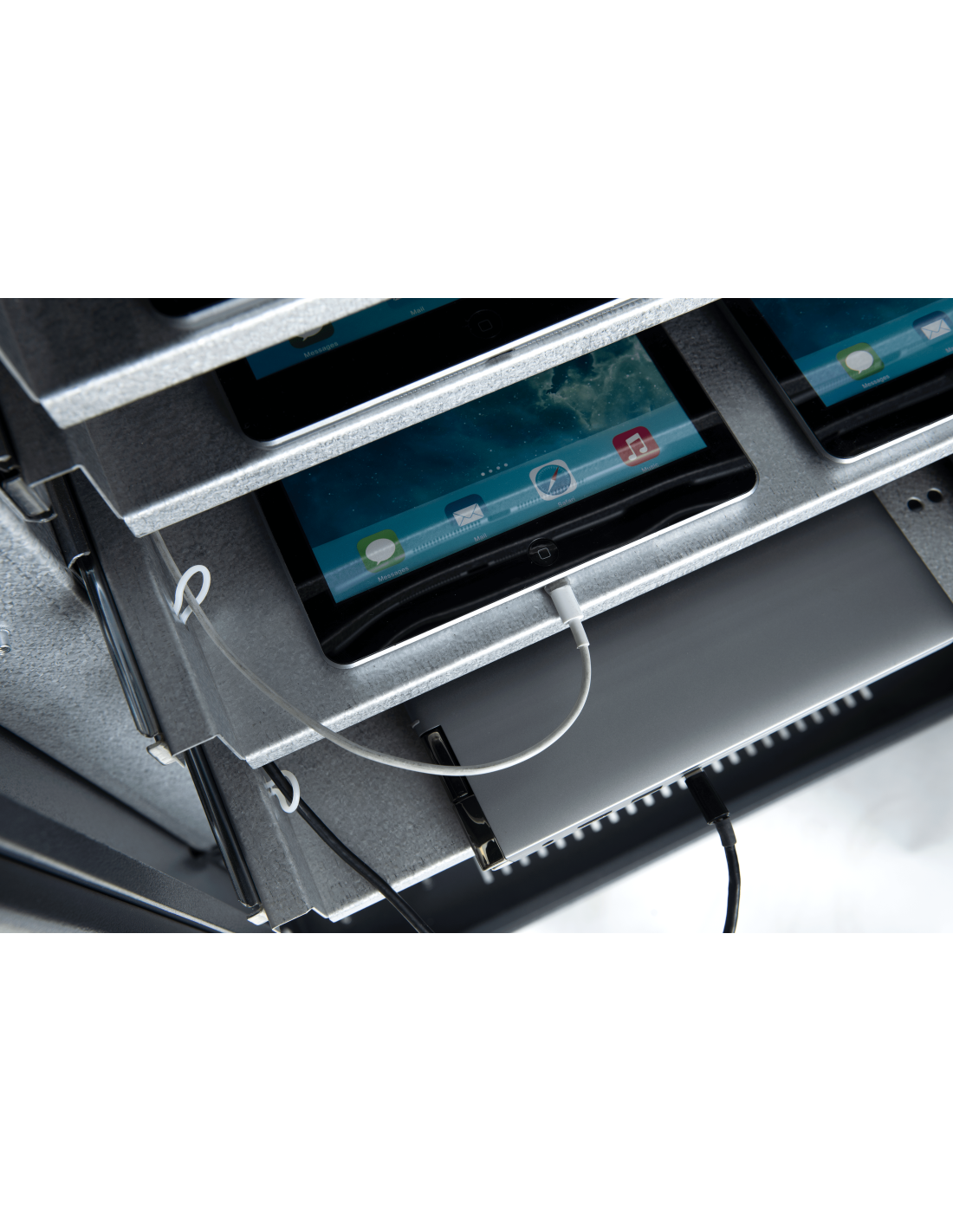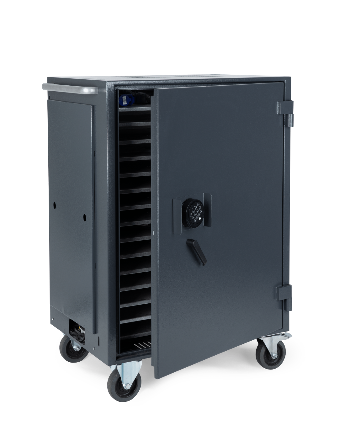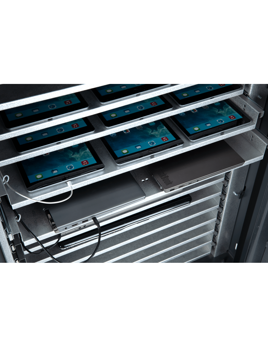 Security is reinforced by a key lock supplied with four keys, and an optional code lock. The cart is also equipped with an advanced locking mechanism. For charging and synchronization needs, the cart includes power outlets and can be fitted with additional modules for charging and syncing up to 60 iPads.