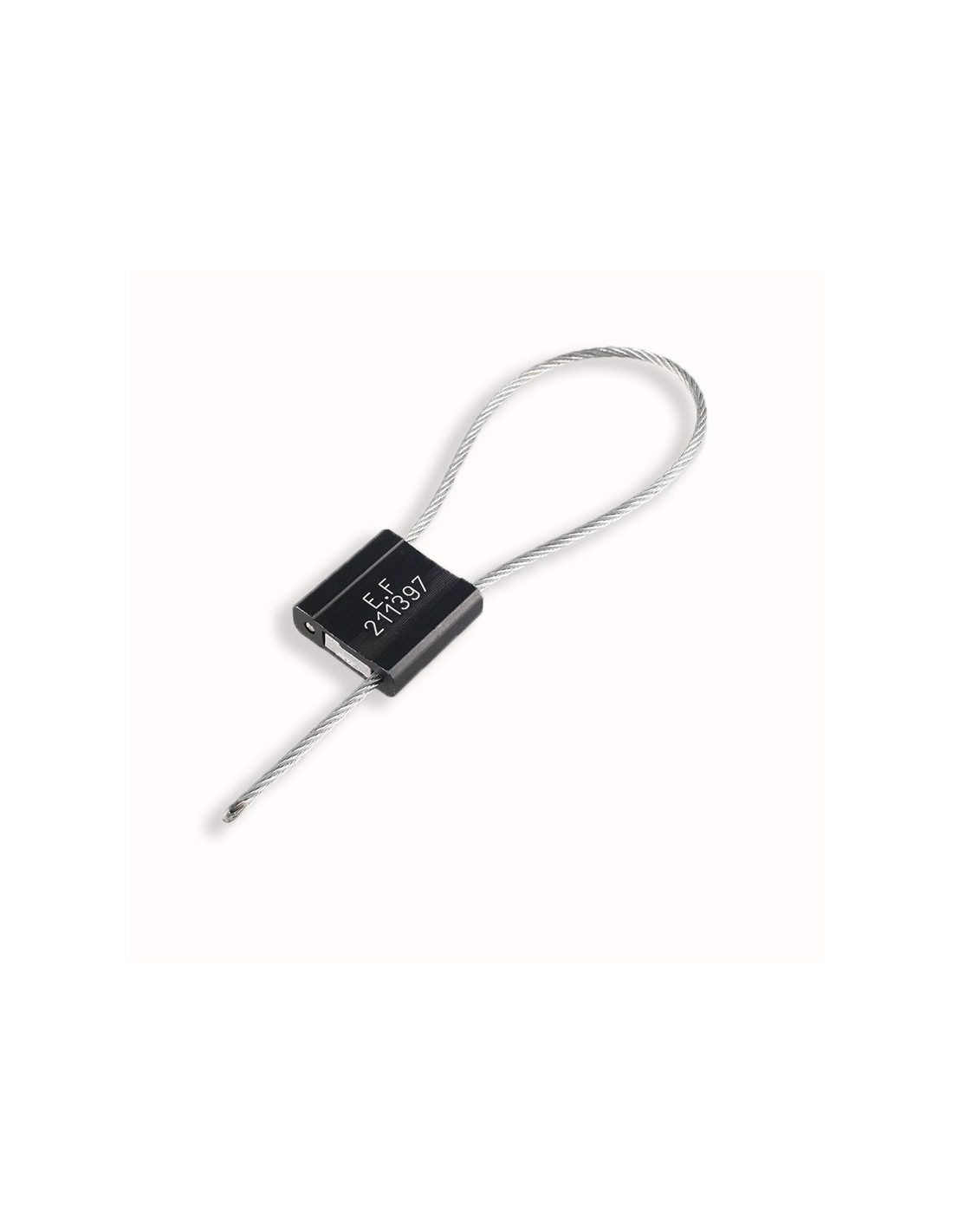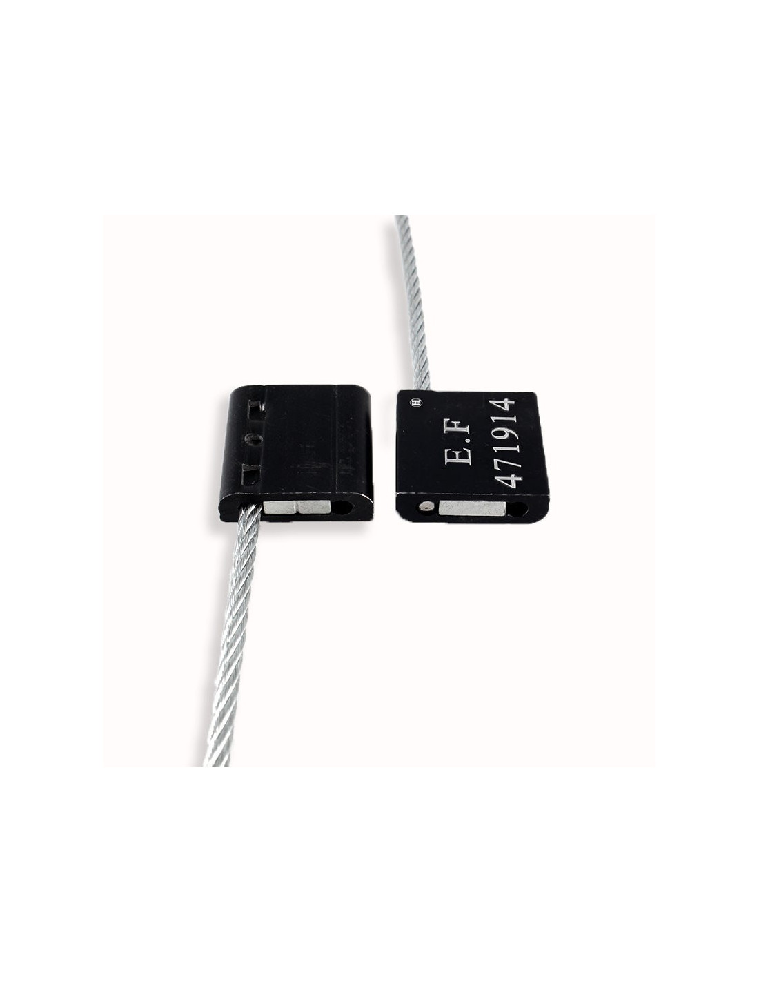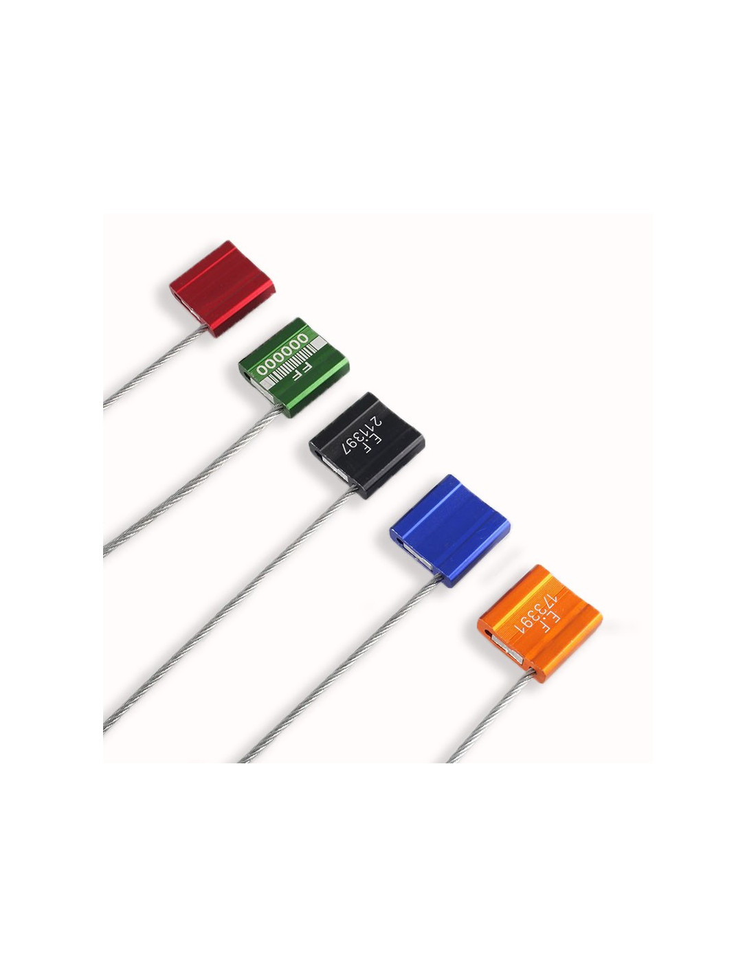 This metallic seal has an aluminium head and a galvanised metal cable. This seal is available in 4 different formats: from smallest to largest we offer this seal with cable diameters of 1.5mm, 2.5mm, 3.5mm, 5mm. Respective to these sizes, these seals are resistant to a pull force ranging from 330kg/ 600kg/ 1200kg to 1600kg. All these seals have a customisable tag of 26x22x6mm / 26x22x6mm / 26x26x6mm / 38x30x6mm and a cable length of 250mm.