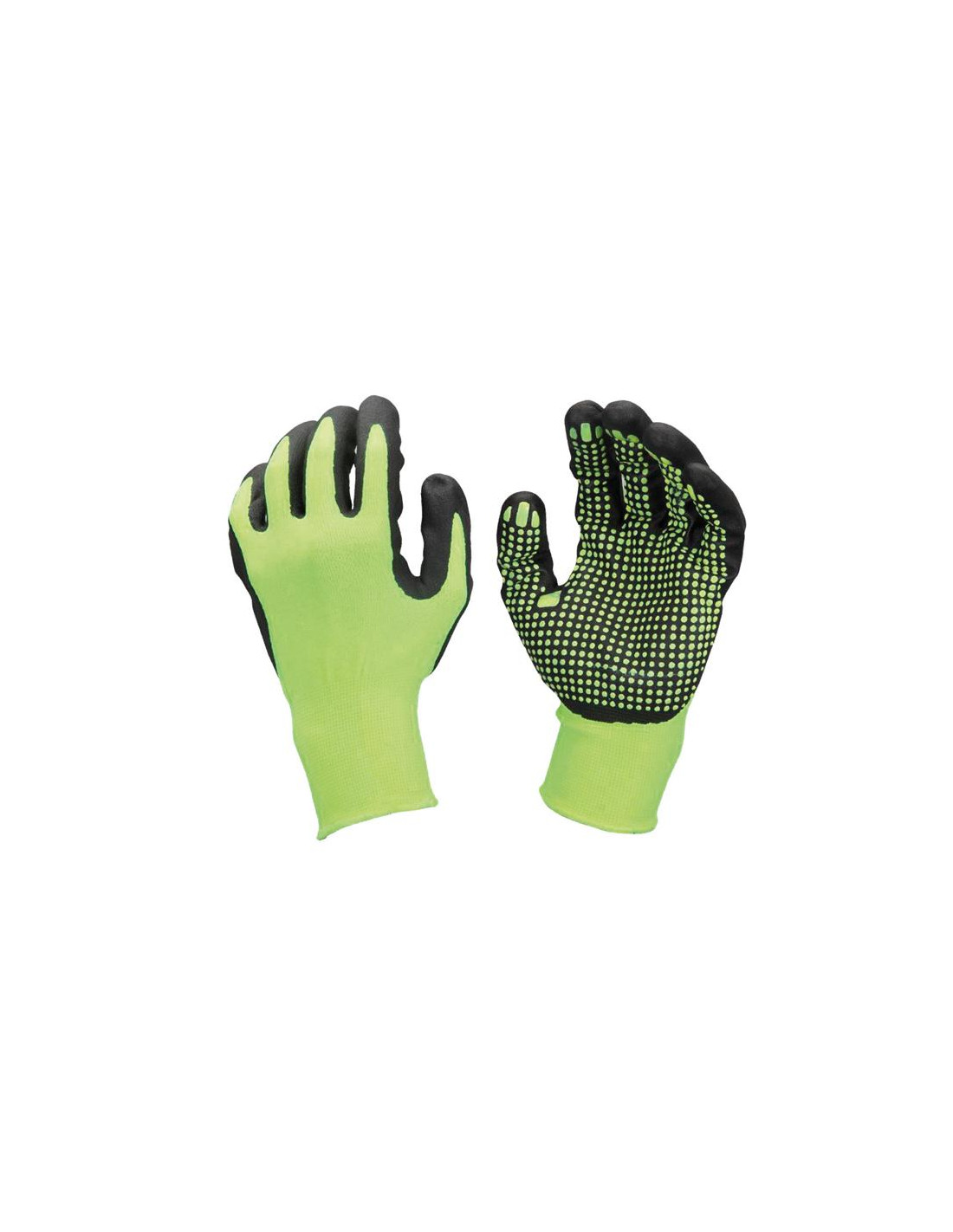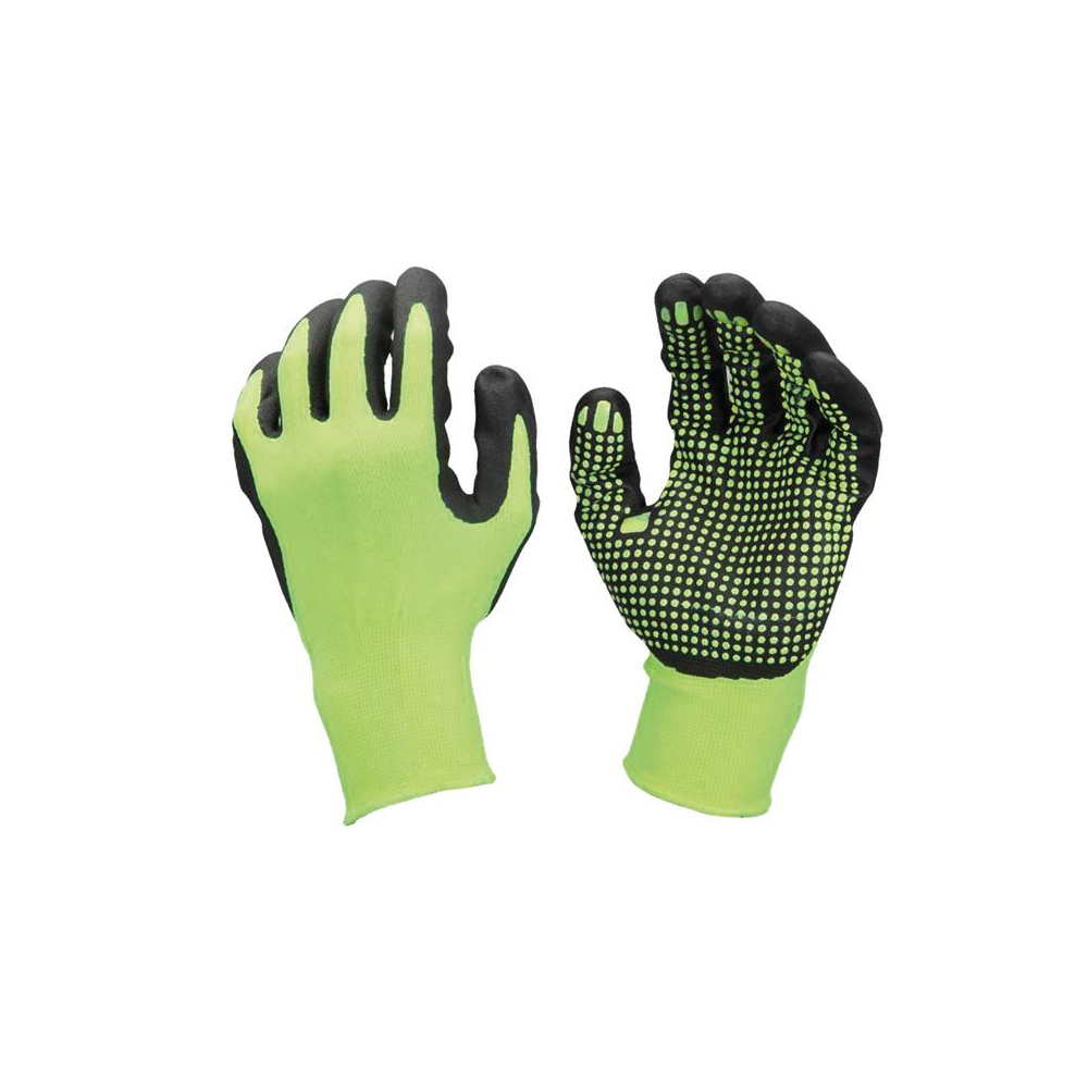 High visibility nylon and spandex seamless gloves - 15 gauge. Nitrile foam dots on palm and fingers. Knitted wrist. Resistant to oils.