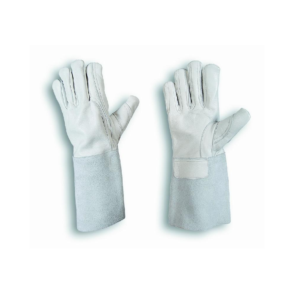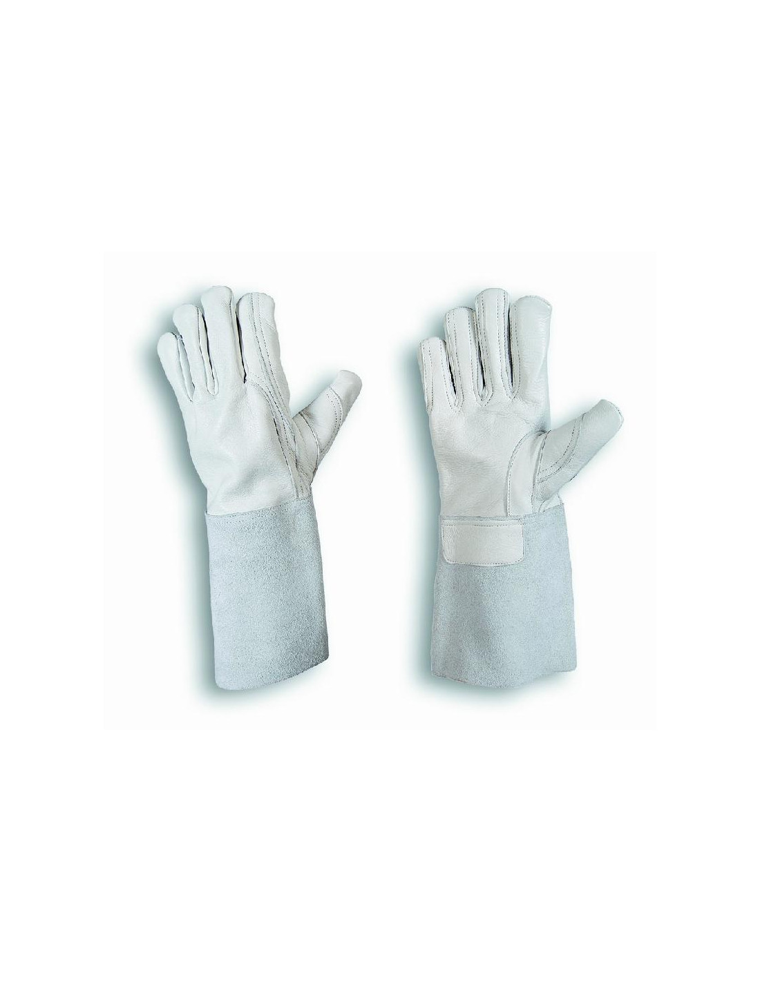 Full-grain cowhide leather glove fully reinforced on the palm, thumb, and fingers. This glove features a 15 cm split leather cuff (thickness 1.1 - 1.2 mm) and a full-grain leather reinforcement for vein protection. Sewn with KEVLAR thread.