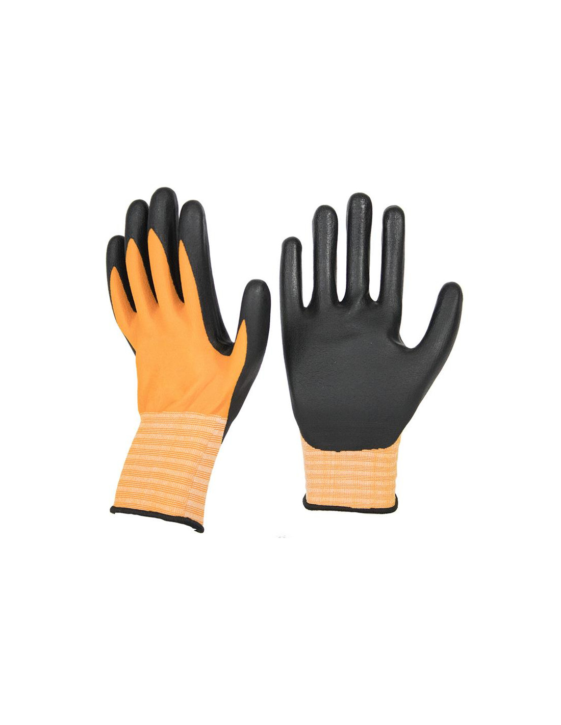 Nylon/spandex gloves coated with seamless nitrile foam - Gauge 18 - DMF free - Orange/black color.