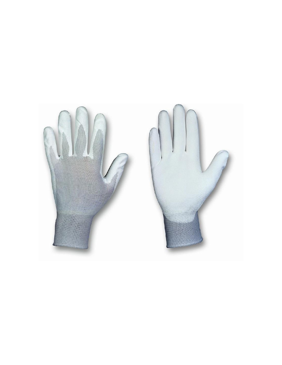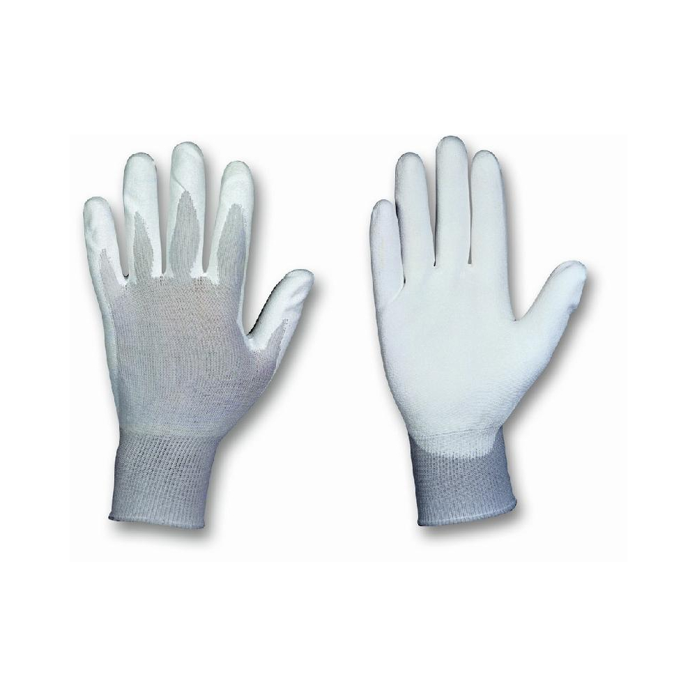 White seamless nylon glove - 13 gauge, white polyurethane coating on palm. Knitted elastic cuff. Ideal for precision work.