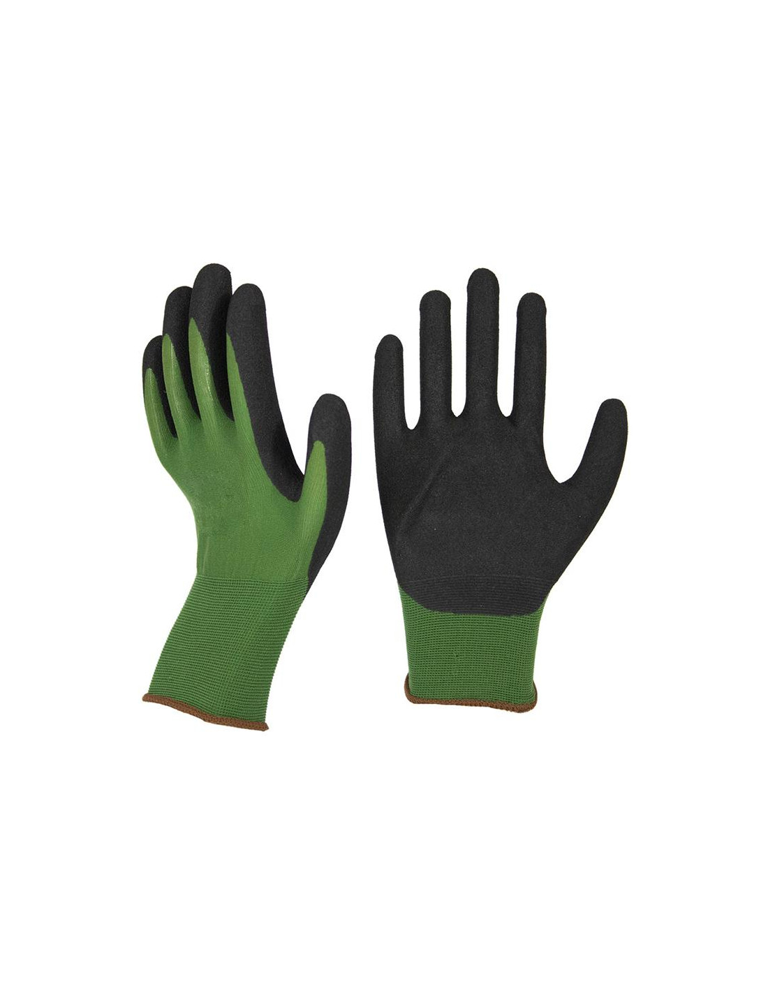 Nylon support glove with black nitrile coating. Sand finish for better grip. DMF free. Elastic knit wrist. Color: green/black.