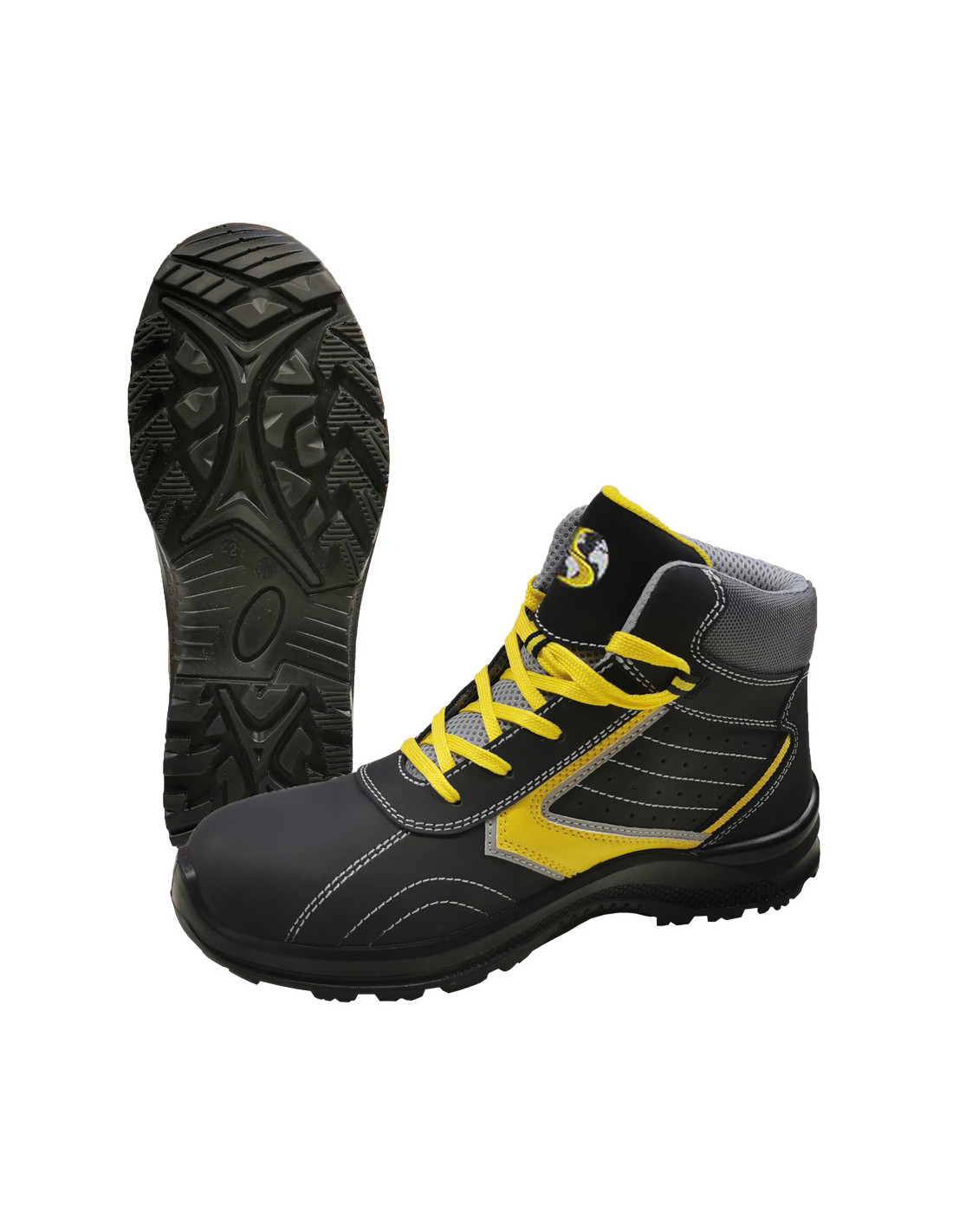 High shoe with steel shell and anti-perforation textile intermediate sole. The full -flower nubuck rod is two -color, black and yellow, with yellow laces. The mesh inside allows good breathability. The double density PU outsole is antistatic and non -slip.