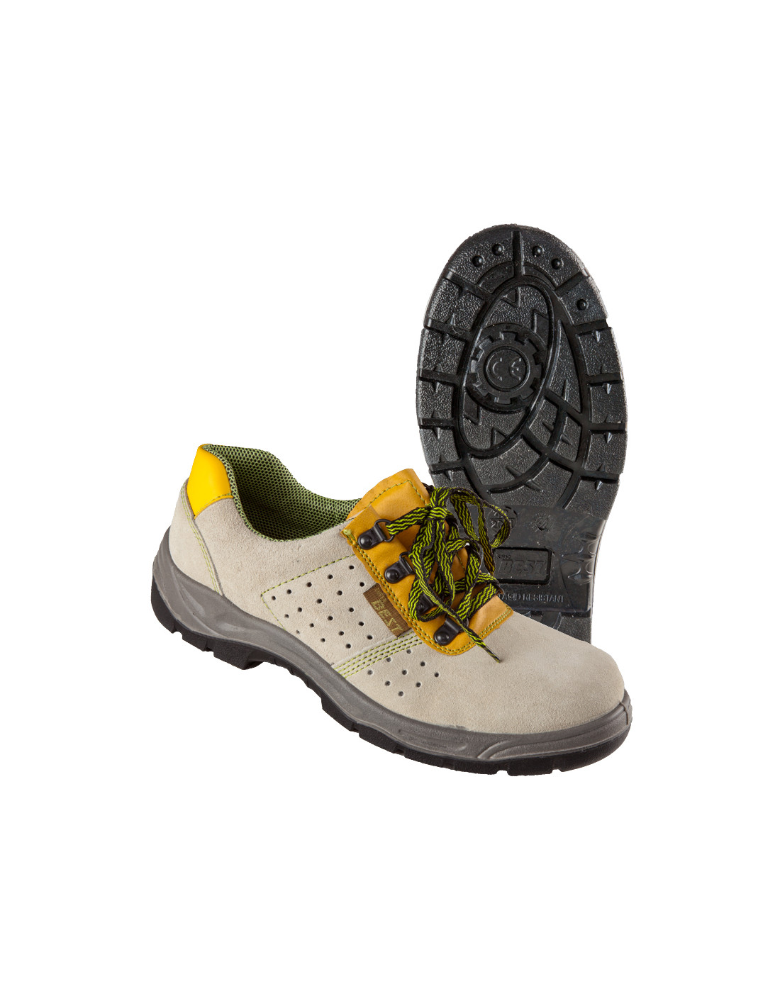Best Basse shoe. The stem is made of perforated beige suede with mesh inside for better breathability. It closes with laces and is designed for the summer. The collar is padded for more comfort. It is equipped with a steel tip and a textile anti-perforation sole. The dual density PU outsole is antistatic, non -slip and resistant to oils and hydrocarbons.
