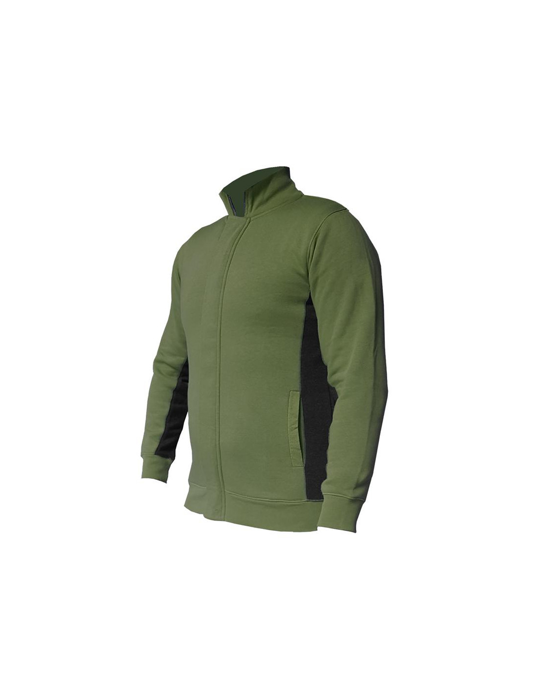 52% cotton sweatshirt, 40% polyester and 8% elastane, with a weight of around 280 g/m2. It has a rising collar, a zipper on the front and two side pockets. Available in blue.