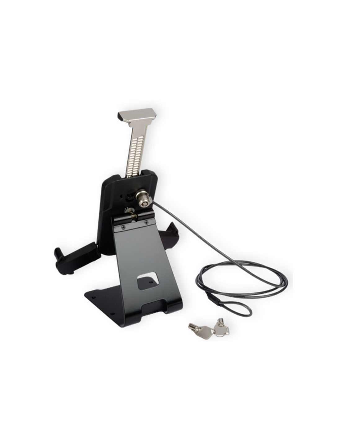 This universal anti-theft stand for tablets is exclusively made of metal (iron base, aluminum handle) which ensures high resistance to removal.