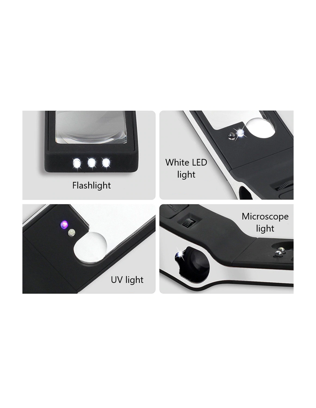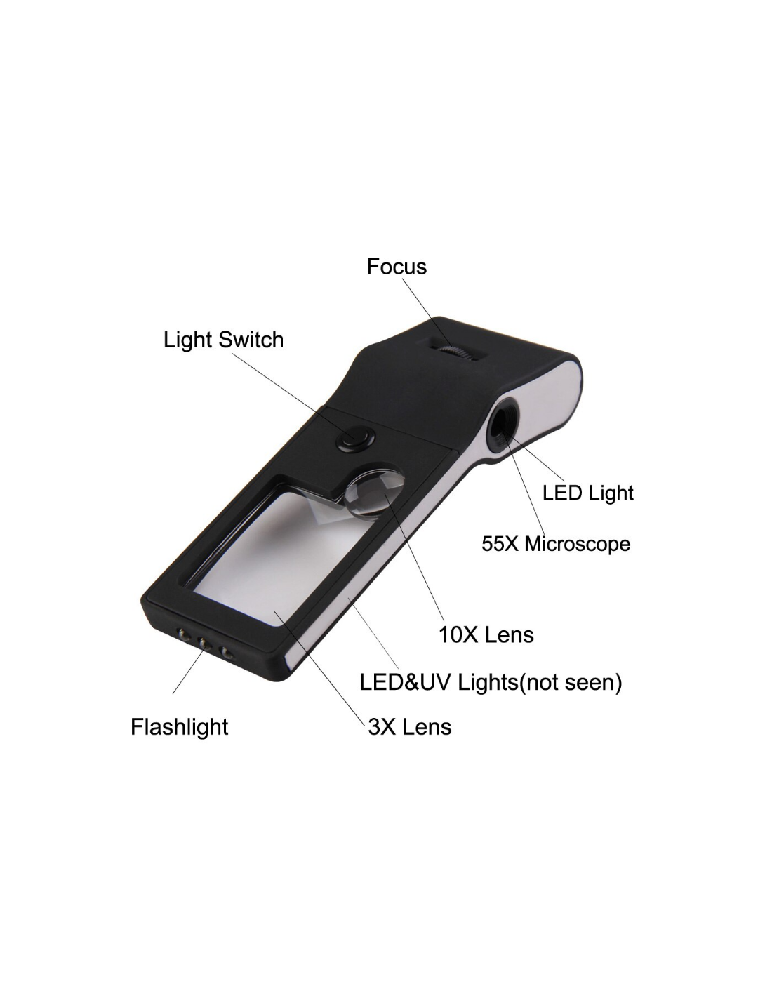- - 3 front LEDs - 1 white magnifying LED - 1 UV magnifying LED - 1 microscope LED