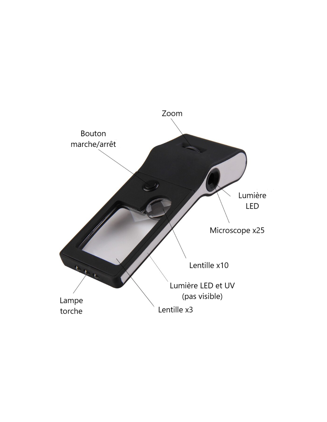 For immediate control of secure official documents and to protect you from fraudulent procedures, quickly check the security points of your secure documents with this 6-in-1 pocket magnifier.