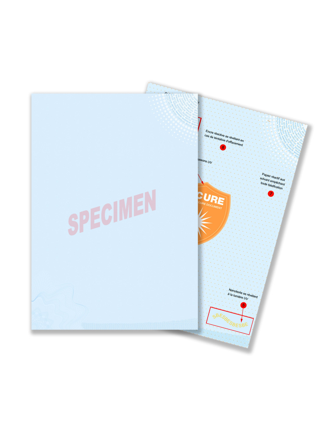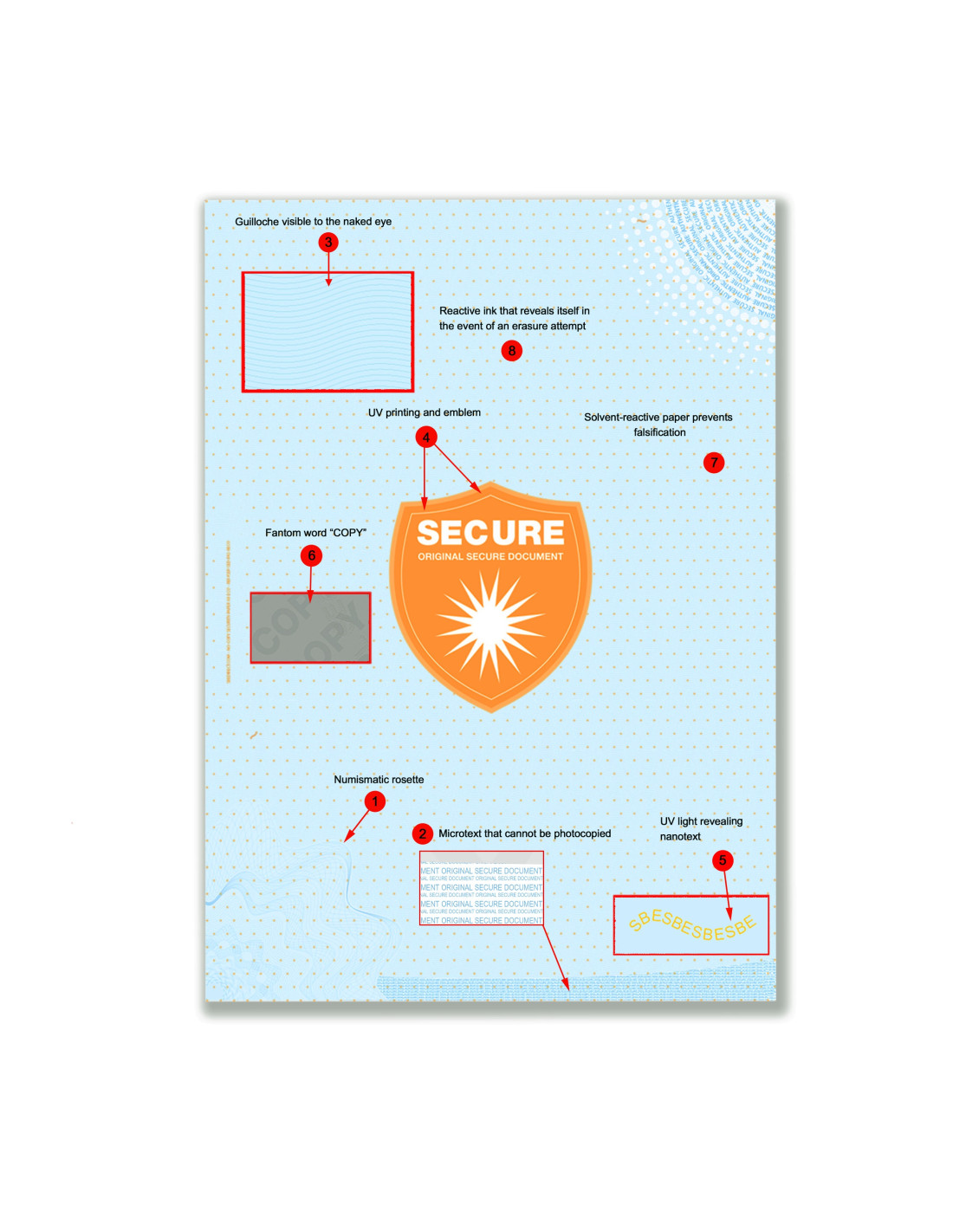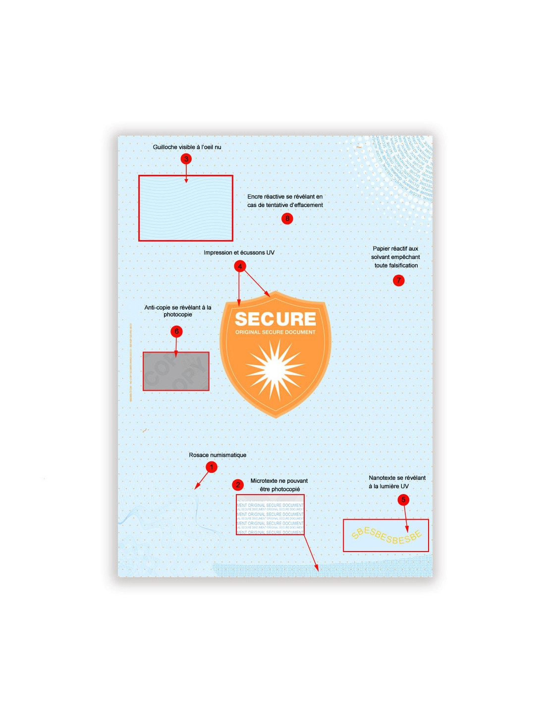 The degree of security of your document obviously differs according to the number of control points present on the chosen secure paper. In fact, the more control points a security paper has, the more effective it is against undue falsification by a third party. Here, the X8 security paper has 8 security points, guaranteeing a more than excellent document security.