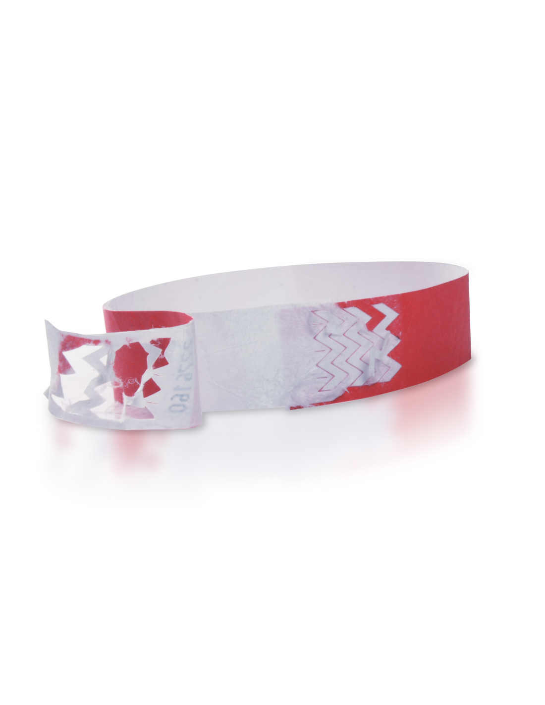 This monitoring and identification wristband is worn around the wrist and fastened with the help of a permanent adhesive fastener to avoid fraud. Thanks to the secure fastening system the only way the user can remove the wristband is by cutting it. This one-time use Tyvek wristband is generally used for events that last one day.
