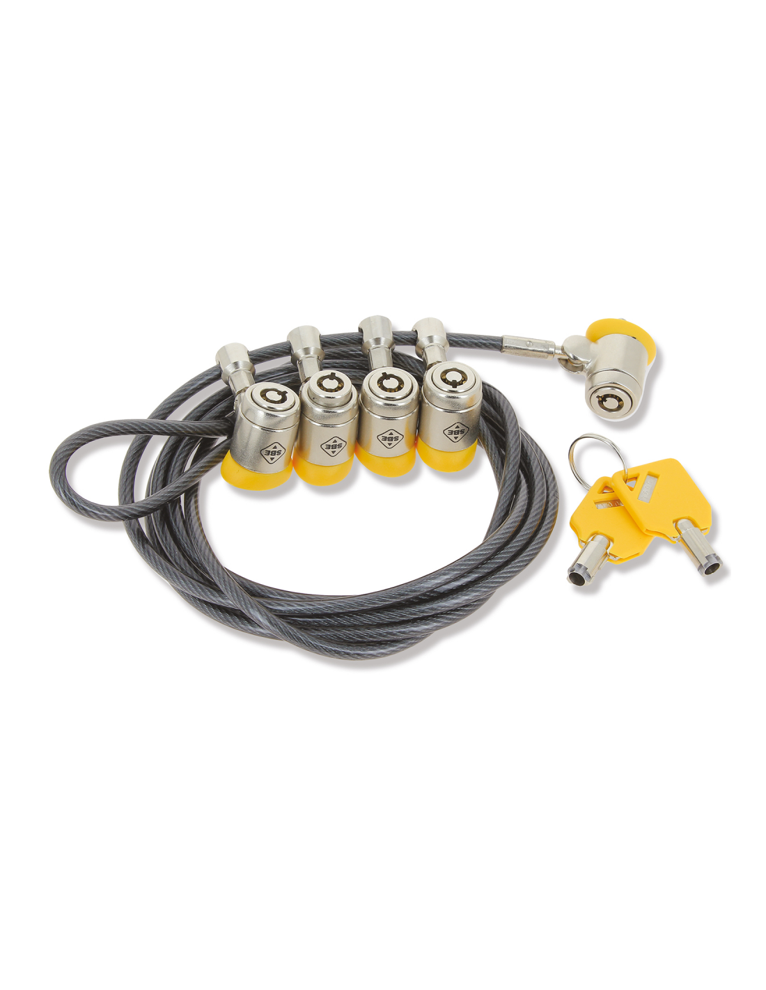 Conçu spécialement pour sécuriser jusqu’à 5 ordinateurs (ou autres périphériques avec encoche de sécurité standard), ce câble est doté de 5 serrures inviolables (même clés). Le cable antivol PC multitêtes s’adapte également à tous les périphériques dotés d’une encoche de type Kensington et de type antivol iMac .