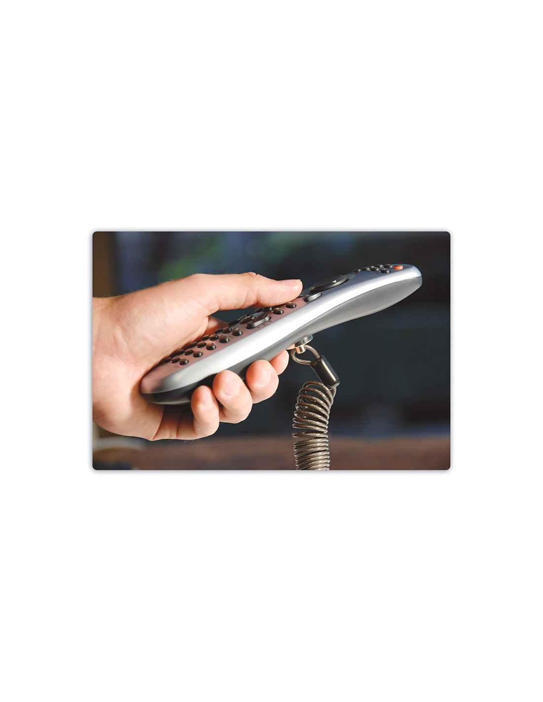 Ce câble antivol en acier (Ø 1,5mm, Ø total 2,3mm) difficilement sécable se présente en forme de spirale pour une meilleure amplitude de mouvement et un encombrement minimum une fois replié. A chaque extrémité du câble antivol est attachée une mini plaque d’ancrage ronde (Ø 20mm) qui se colle pour l’une à la télécommande (ou tout autre appareil de petite taille), pour l’autre à un point d’ancrage fixe (un mur, un meuble...). L’installation, très simple, est définitive.