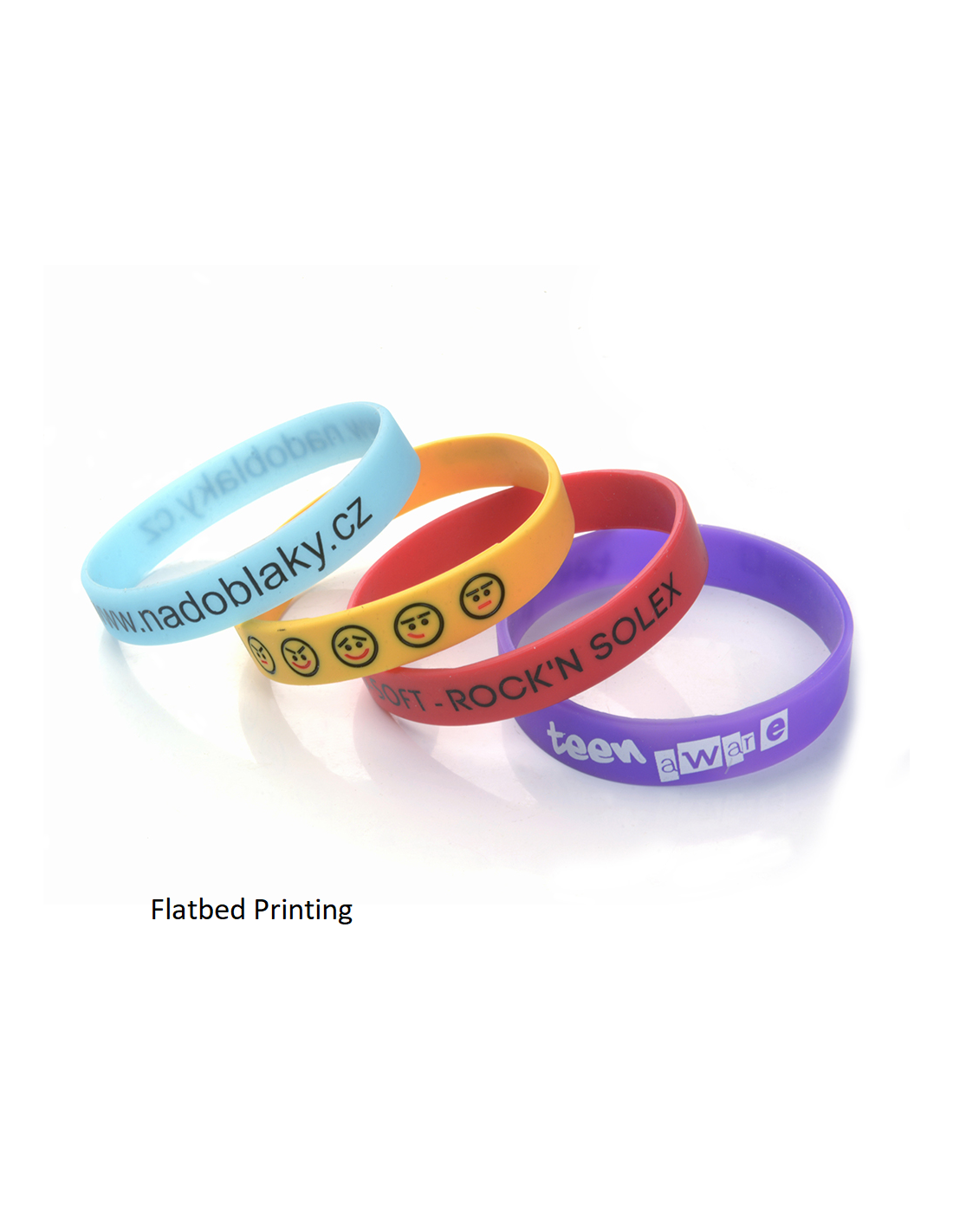 - À plat : Le logo de votre marque est imprimé sur le bracelet silicone. C'est l'option de base qui est la plus commune;