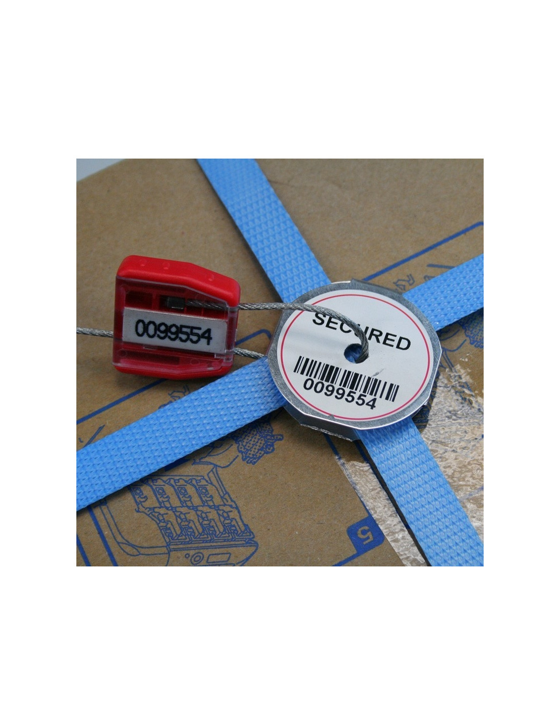 Ce set de scellé de sécurité pour feuillard est composé d’un scellé câble rouge et d’un feuillard métallique repliable pour sécuriser les caisses et palettes.