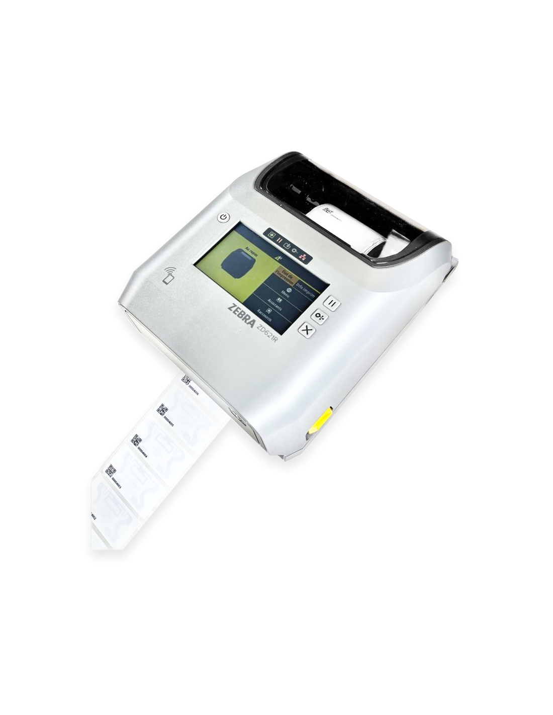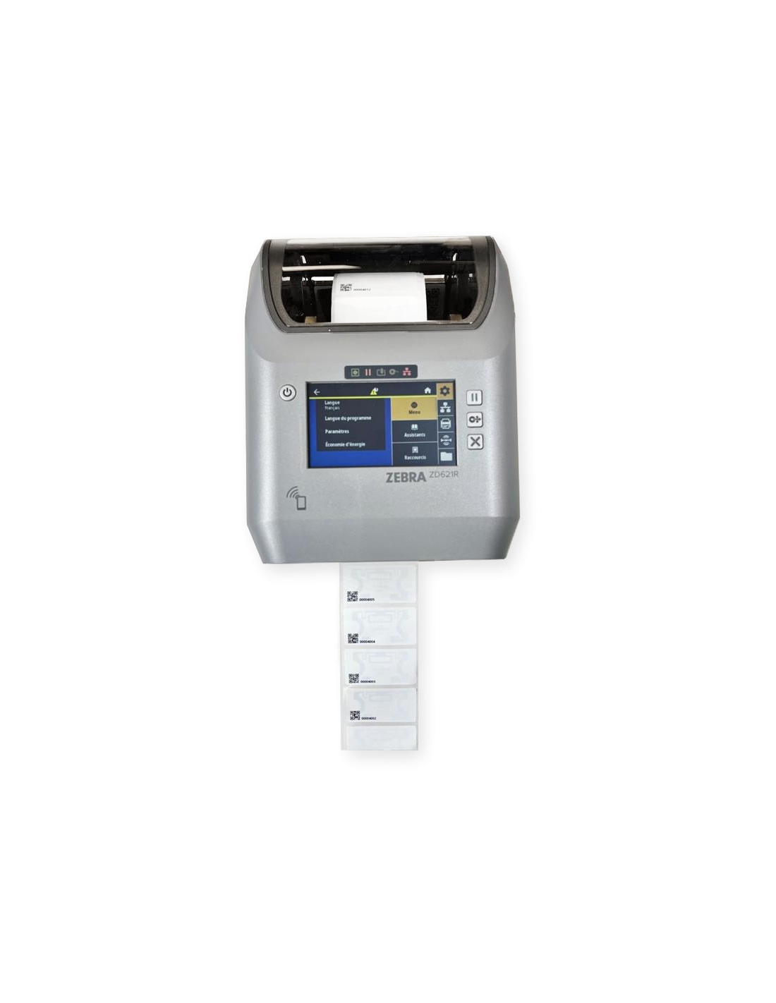 Chaque étiquette comporte un numéro de série visible à gauche, un QR code scannable par smartphone, et est également compatible avec les lecteurs RFID HF.