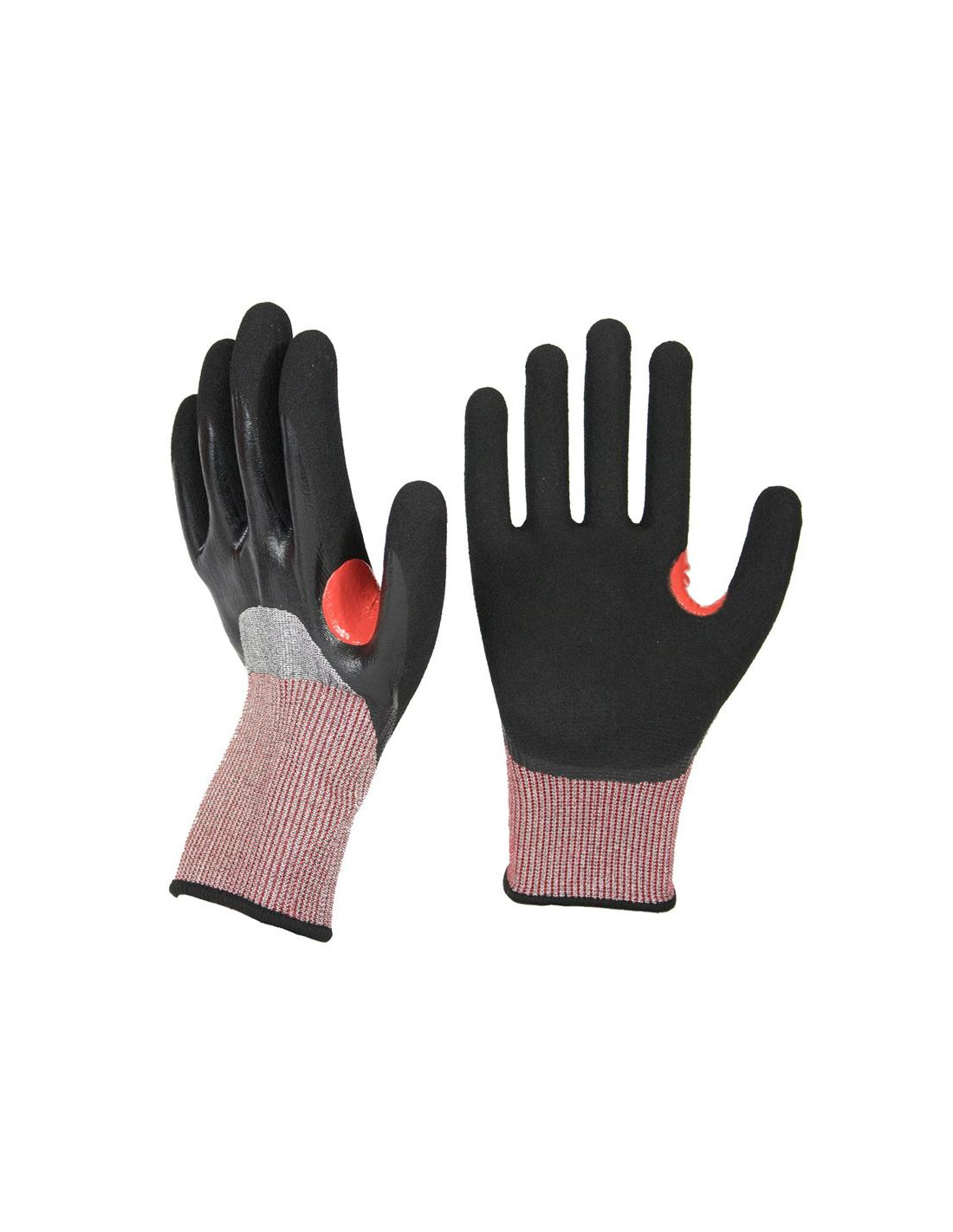 Gant en fibre de verre sans coutures résistant à la coupureenduction nitrile - Jauge 13 - Finition sablée. Pouce et index renforcés. Coloris rouge/noir. Poignet élastique tricoté Certification: EN420 – EN 388 - Niveau de résistance à la coupure C.