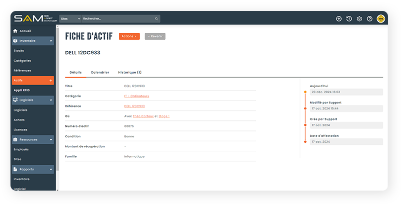 Qu’il s’agisse de matériel informatique, de logiciels, de garanties, de contrats de maintenance ou même de numéros de série spécifiques, tout est personnalisable. Vous pouvez suivre les emprunts, pertes, casses, dépréciations, alertes de maintenance… et bien plus encore.