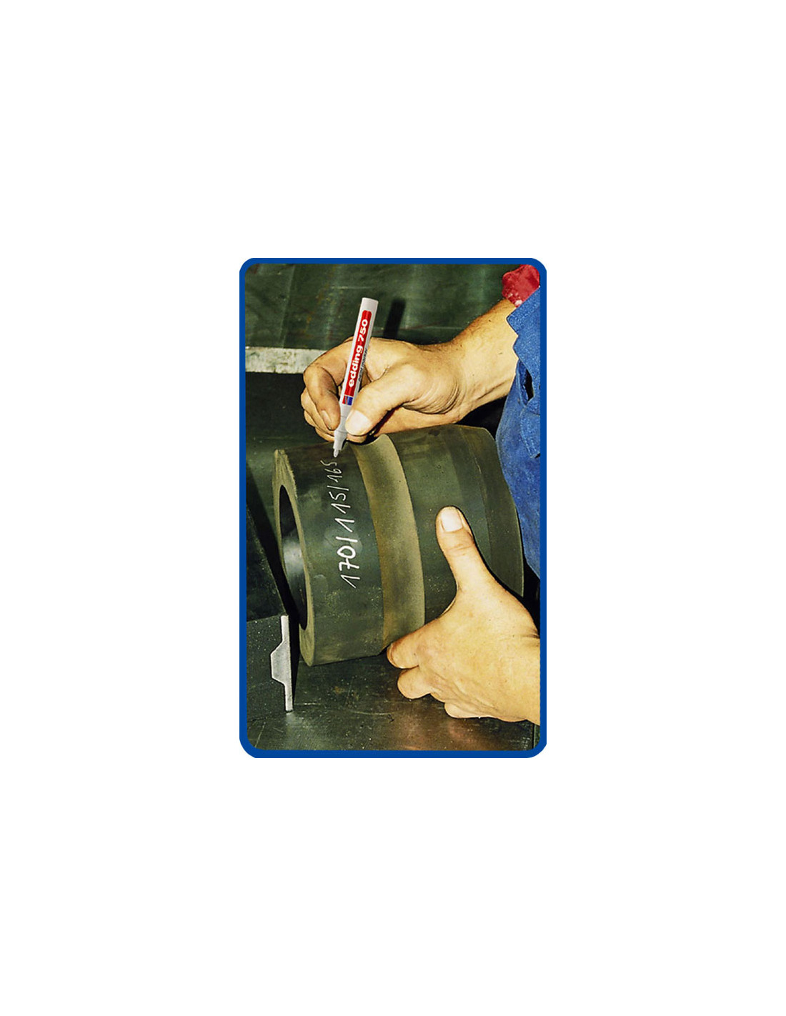 Ce marqueur industriel permet un marquage précis sur tous types de surfaces (débit modulé par valve), même poussiéreuses ou huileuses. Sans odeur et à séchage rapide. Pointe ogive de 1-2 mm.