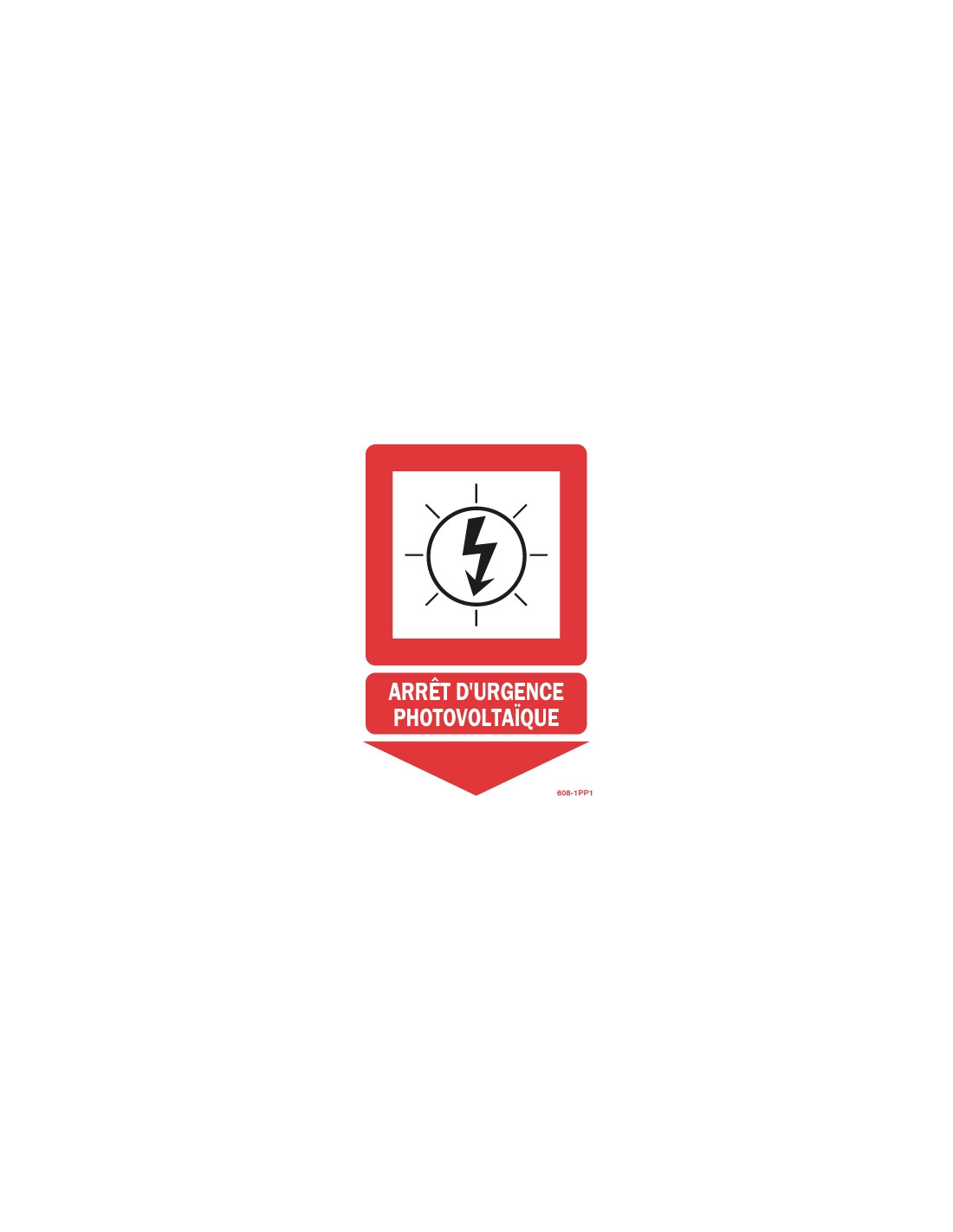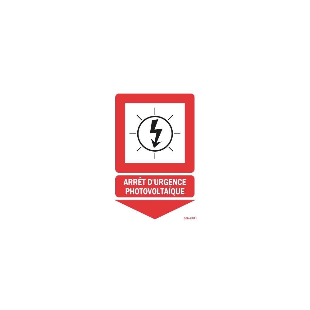 Ce panneau permet d’indiquer où arrêter d’urgence le photovoltaïque, notamment grâce a sa couleur rouge voyante de loin et à sa flèche vers le bas.