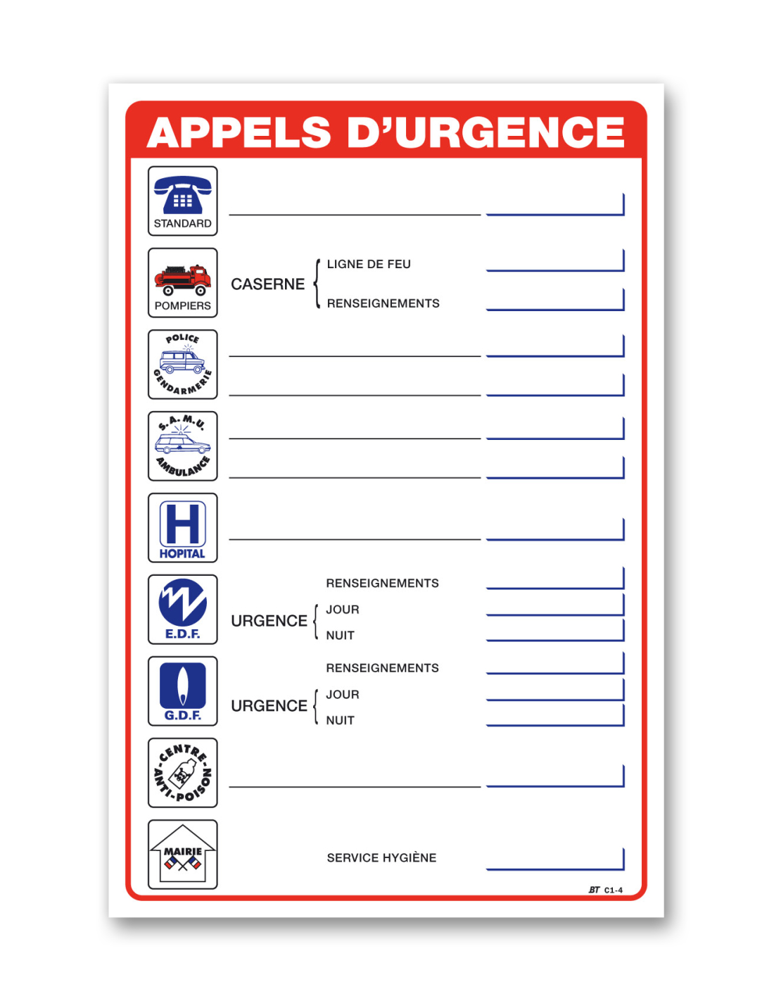 Ce panneau rassemble tous les numéros d’urgence utiles en cas d’incident. Consigne à placer à l’accueil, au standard ou à proximité du téléphone.