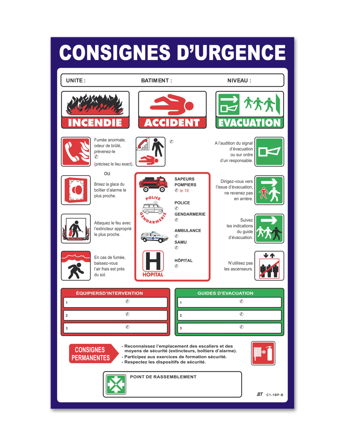 Ce panneau, clairement identifiable, rassemble toutes les informations utiles en cas d’incendie (consignes, numéros utiles et évacuation)