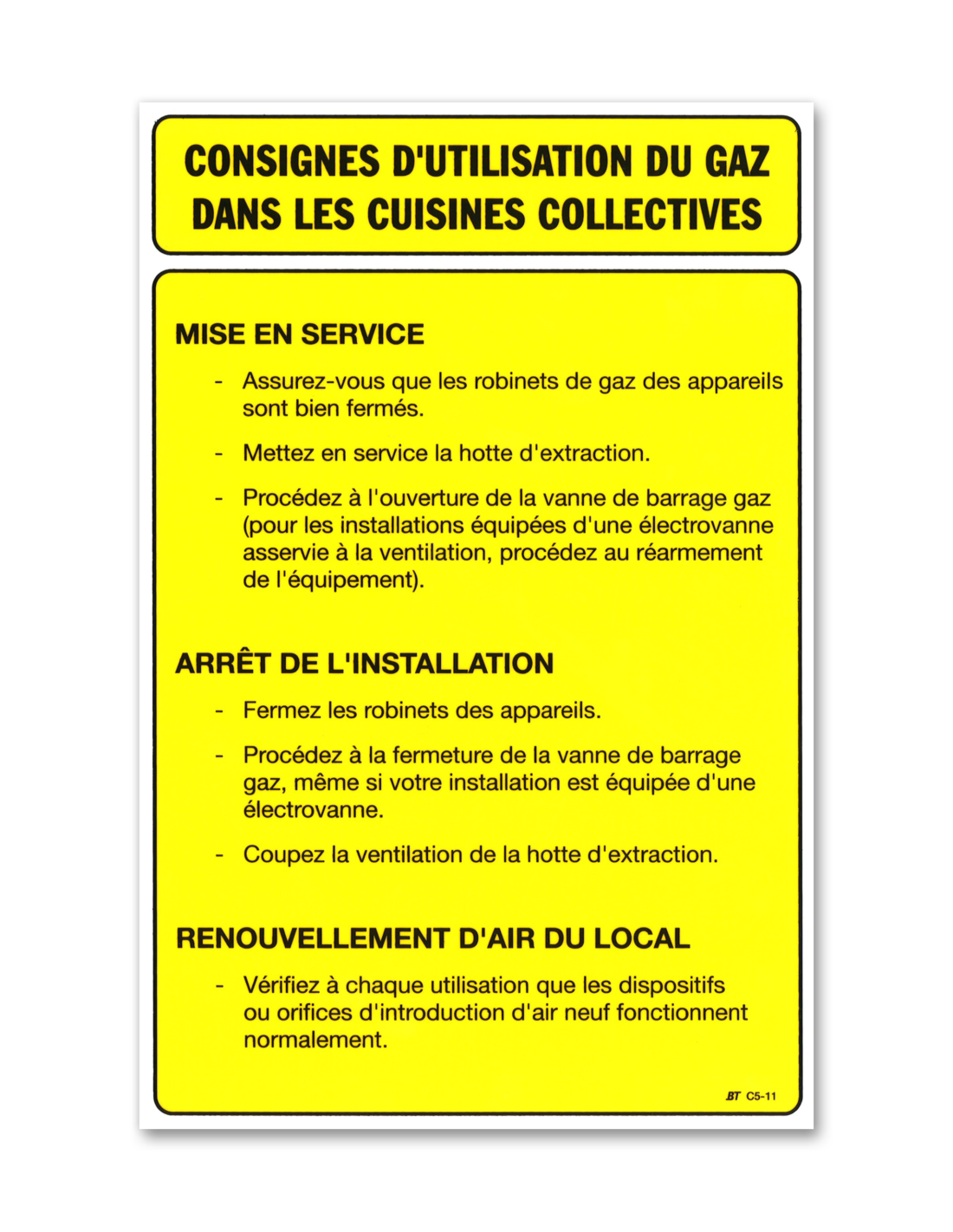 Ce panneau rappelle la procédure à appliquer lors de l’utilisation du gaz en cuisines collectives.