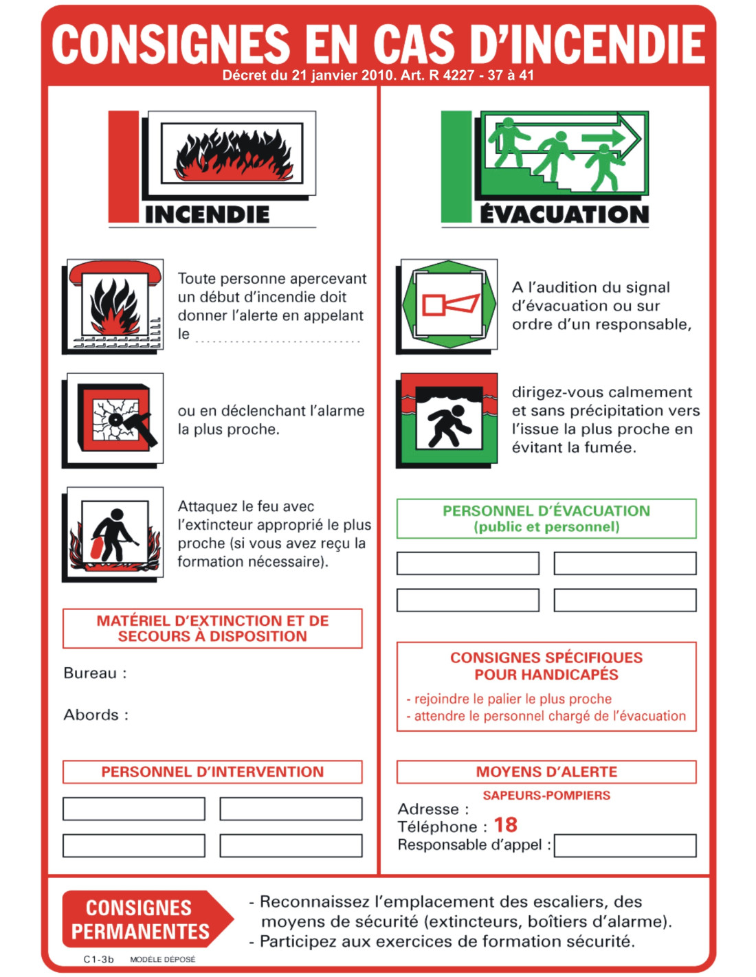 Consigne en cas d’incendie adaptée à tous les établissements sous le code du travail recevant plus de 5 salariés, consigne obligatoire par article R4227-37 du code du travail. Consigne donnant les instructions en cas d’incendie et d’évacuation. S’affiche dans les circulations, les locaux à risque et/ou les lieux de passage (Cafétéria, hall, salle de pause....)