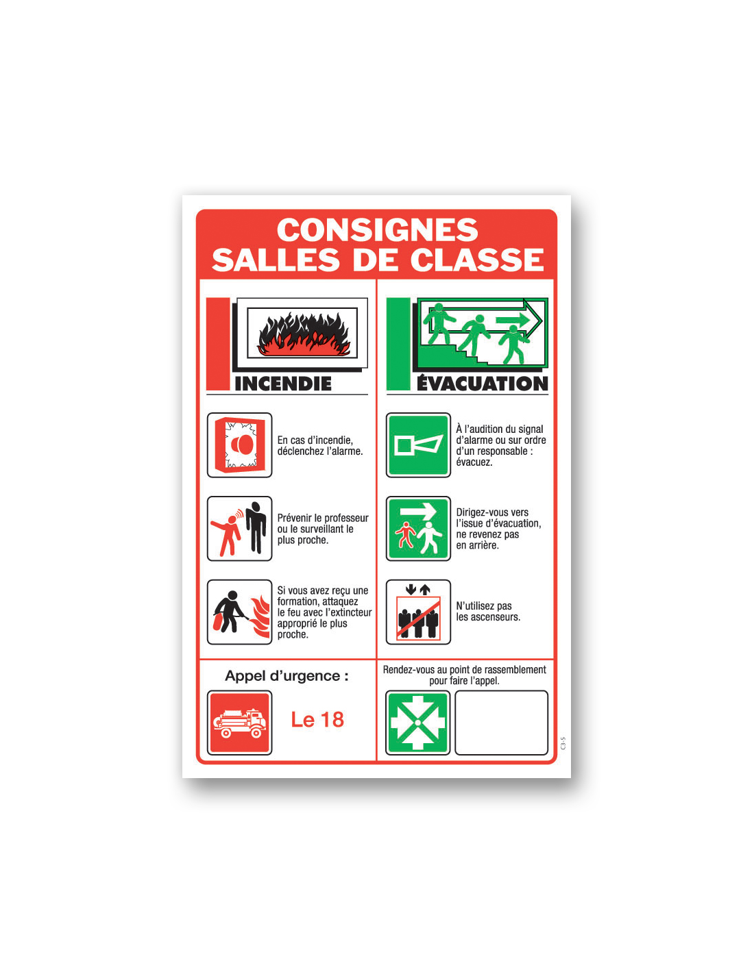Ce panneau spécifique aux salles de classes rassemble toutes les informations et précautions concernant l’évacuation et les précautions à prendre en cas d’incendie.