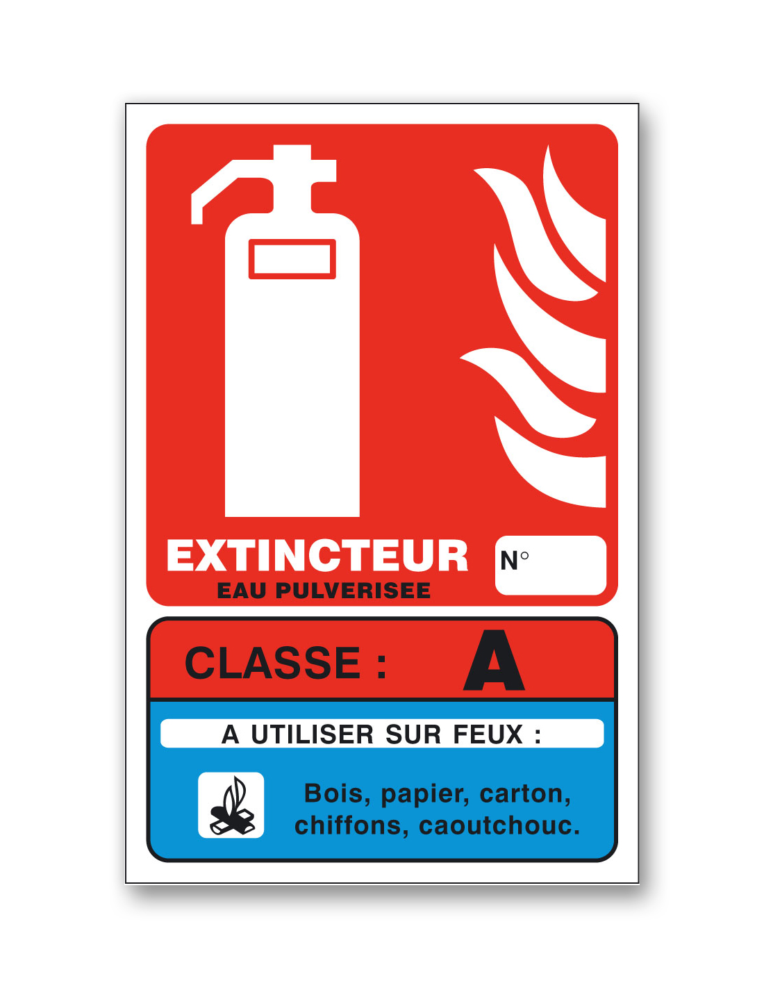 Ce panneau symbolise la présence d’un extincteur pour les feux de Classe A. Il indique en desous son mode d’emploi
