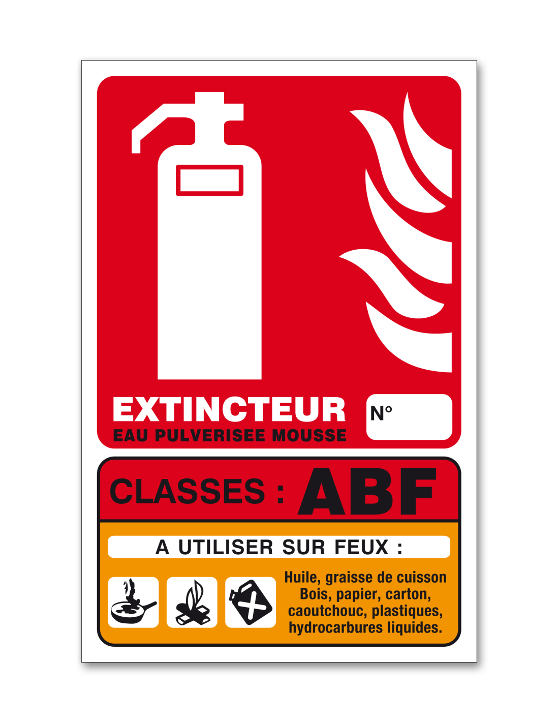 Ce panneau symbolise la présence d’un extincteur pour les feux de Classe ABF. Il indique en desous son mode d’emploi