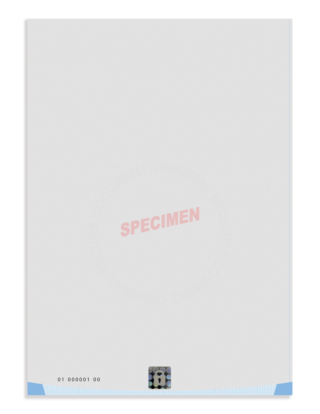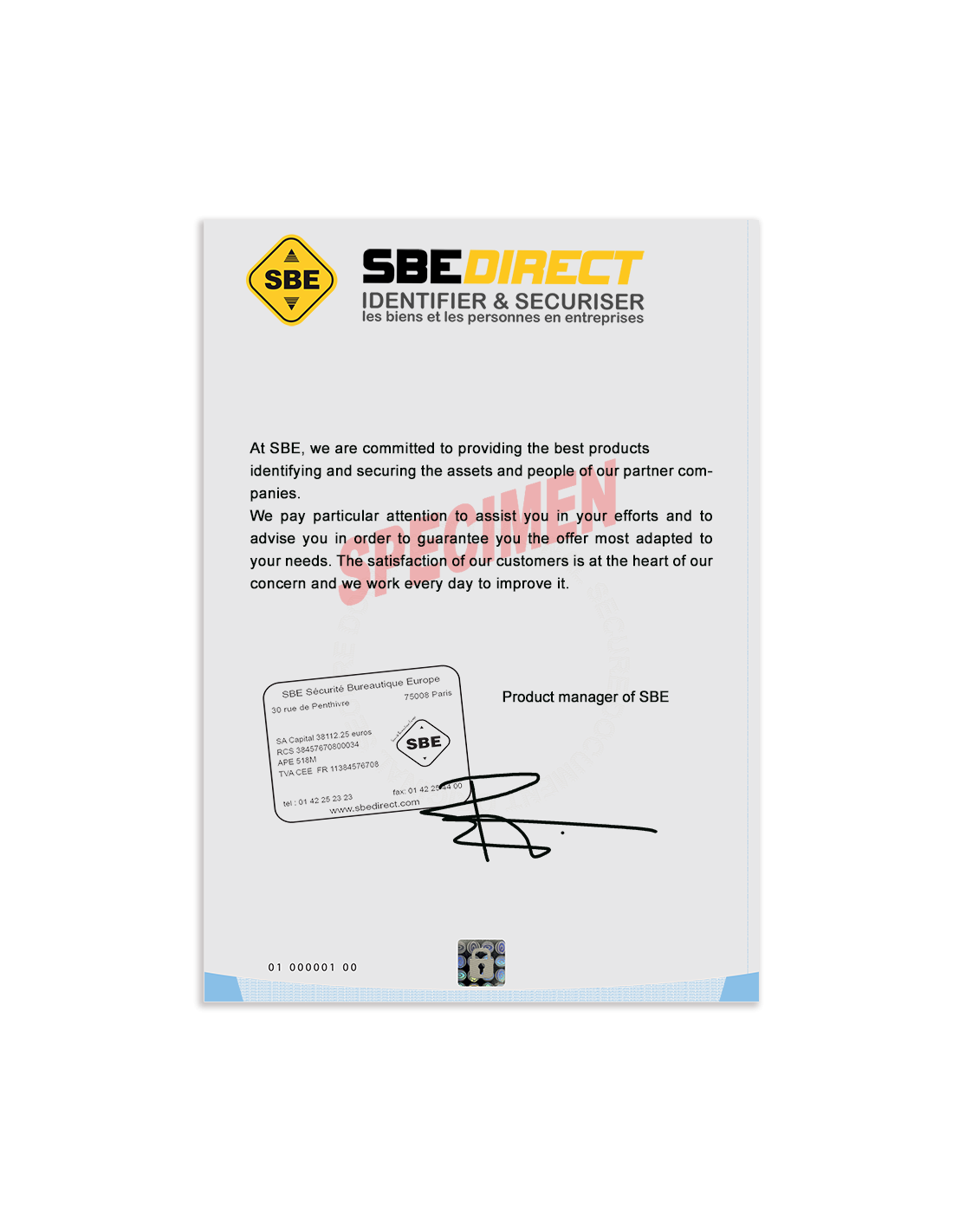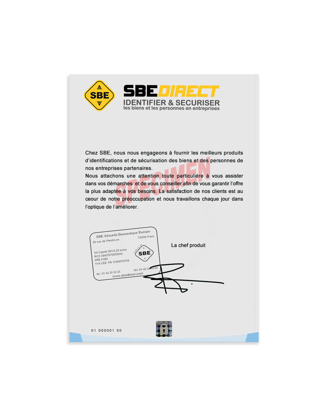 Réaction visible à l’œil nu du papier et de l’encre à toutes tentatives d’effacement (chimique) Le papier a un revêtement spécial qui augmente l’adhésion du toner d’au moins 50 % afin de protéger des potentielles fraudes.