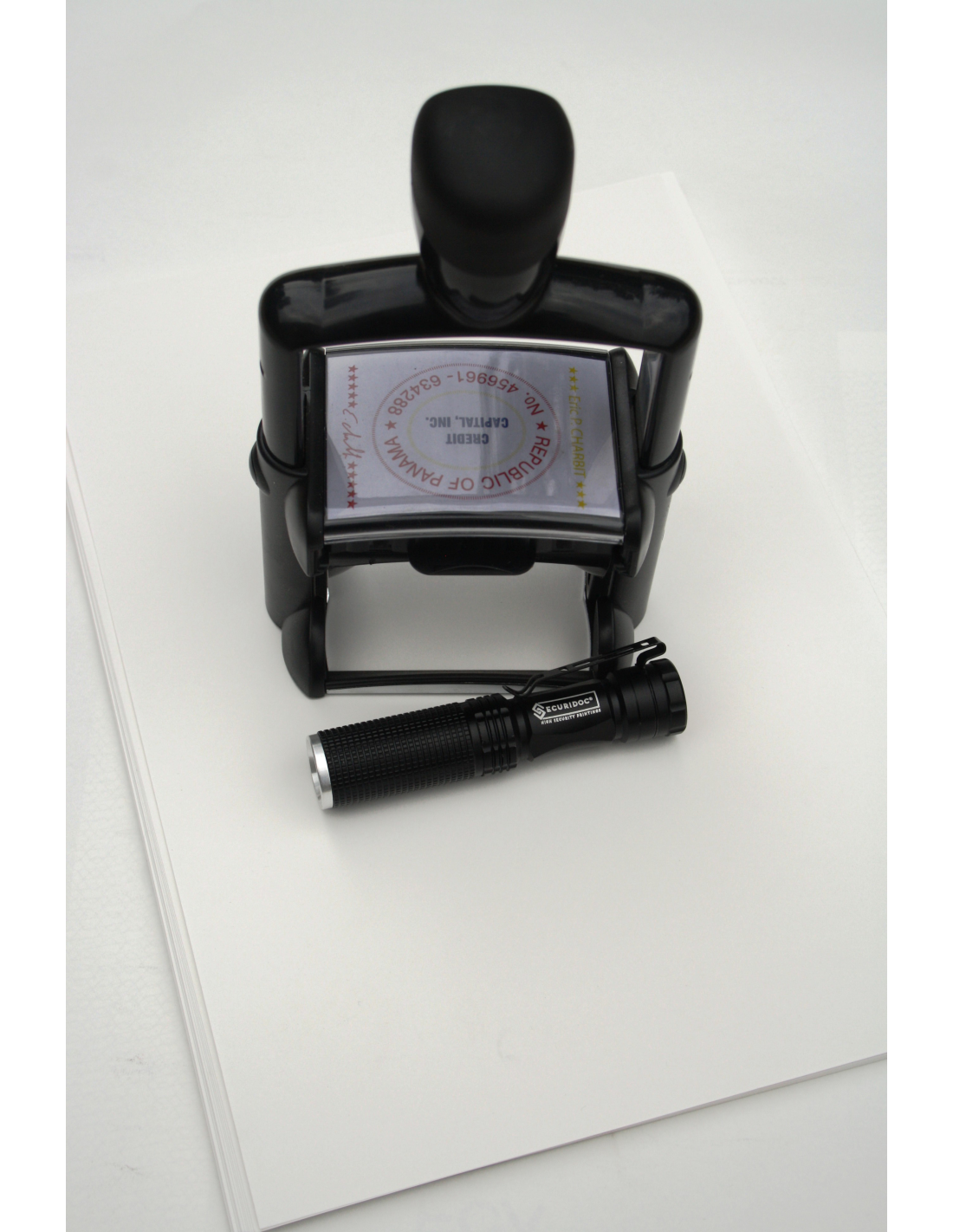 Le tampon encreur personnalisé est similaire à tout autre tampon. De dimensions (11,5cmx7cm) et un poids total de 350 grammes, il reste une solution discrète pour la sécurisation de vos documents. La durée de vie de la cartouche d’encre est exemplaire et permet de sécuriser jusqu’à 15 000 documents. De plus, un numéro de série unique et personnalisable, visible aux rayons UV seulement sur un papier non azurant, peut également être placé. En cas de perte, ou de vol de tampon, nous recréons un nouveau tampon professionnel possédant un nouveau numéro de série, rendant obsolète l’ancien numéro. Ainsi, si un tampon volé est utilisé par une autre personne, la vérification du code série rendra visible la contrefaçon.