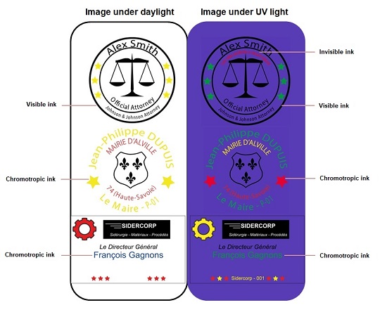 Chromo-tropique : Encre possédant des chaines polymère chimique liées entre elles donnant sous lumière du jour une couleur donnée : rouge, jaune ou bleu et sous lumière UV une autre couleur. L’apport d’UV par une lampe de poche ultra violet vient réorganiser la structure des chaines, transformant les couleurs initiales en nouvelles couleurs : vert, bleu, jaune ou rouge fluorescent. A noter que pour pouvoir utiliser un tampon avec une encre chromotropique, il est impératif de posséder un papier sans azurants optiques, qui ne réagit pas aux rayons UV et fait ressortir l’encre UV.