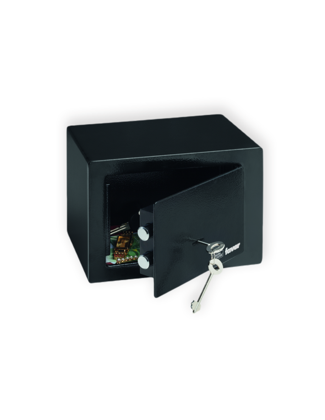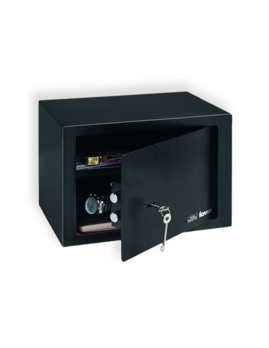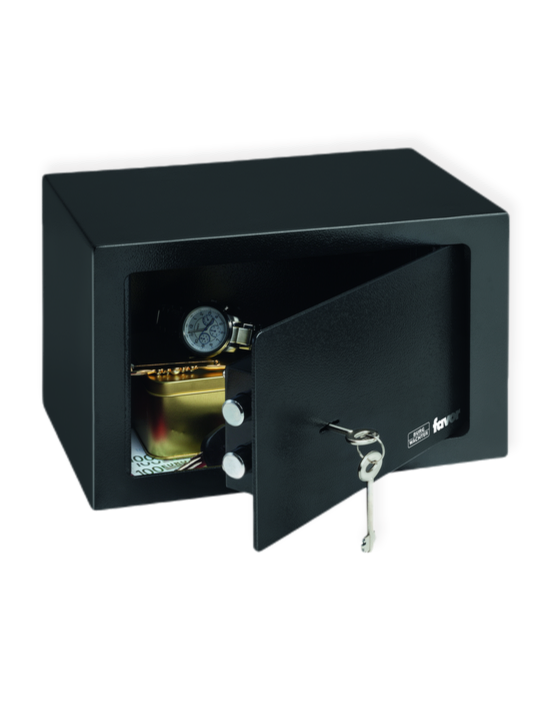Le coffre-fort FAVOR avec serrure de sécurité à double panneton permet d’offrir des millions de combinaisons différentes. Le coffre est robuste avec une simple paroi et il est fourni avec deux clés.