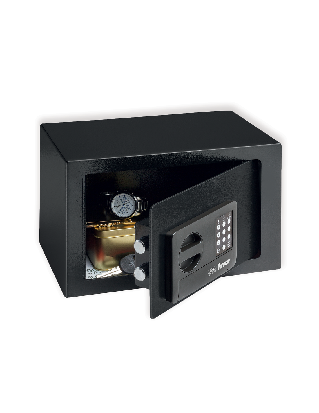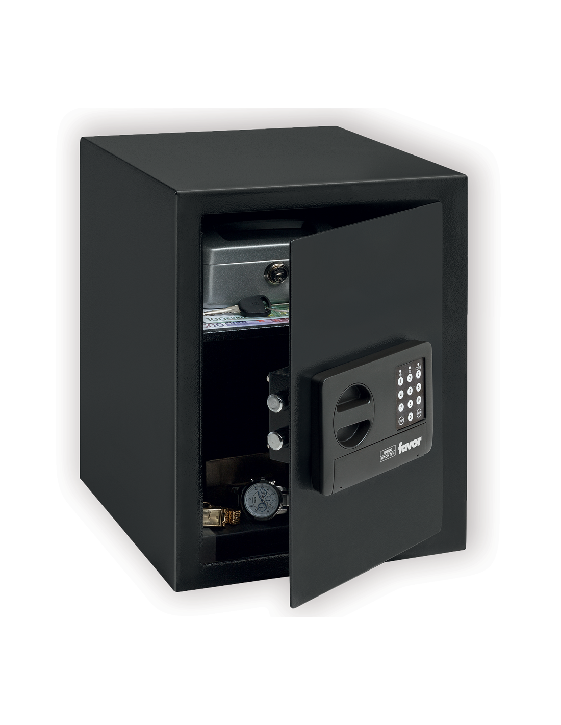 Le coffre-fort FAVOR avec serrure électronique à une utilisation confortable grâce à son verrouillage et déverrouillage qui s’effectue par pênes motorisés. La programmation est d’une extrême facilité. Le coffre est livré avec des piles (4 x 1.5 V type LR6 AA), il nécessite aucun branchement électrique et une clé de secours mécanique est fournie en cas de besoin. Il est robuste avec une simple paroi et il est fourni avec un clé de secours mécanique. Attention de ne jamais laisser la clé de secours dans le coffre.
