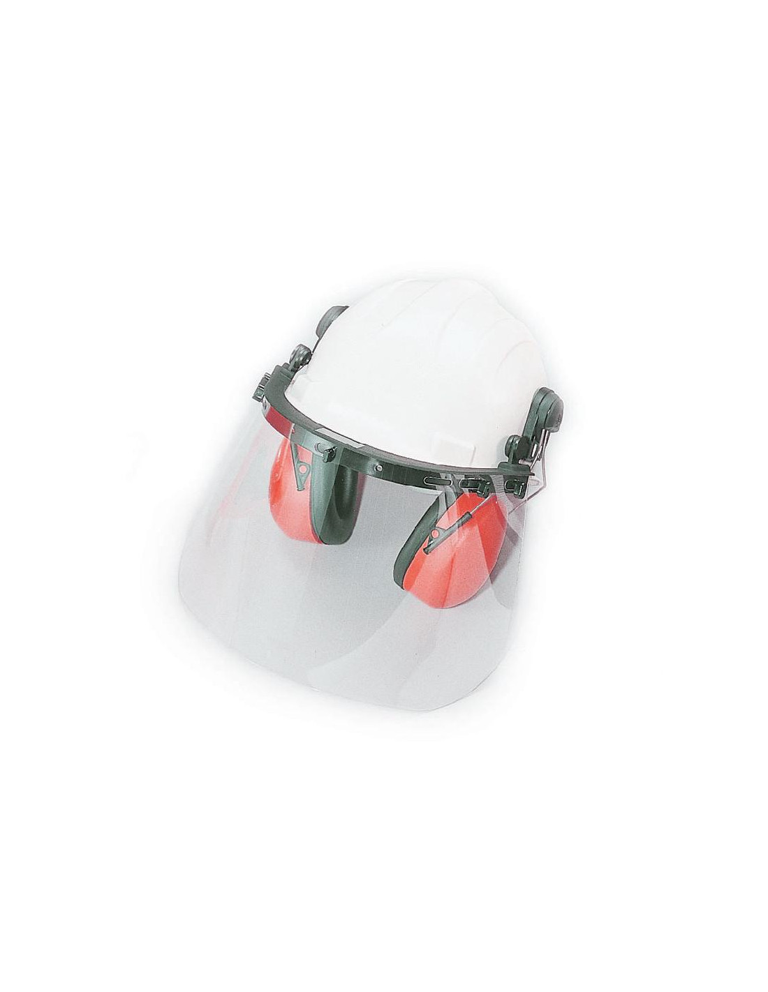 Casque de sécurité antibruit blanc certifié EN 397 avec écouteurs rouges certifié EN 352 et visière incolore incluse. Atténuation du bruit SNR 25,9 dB.