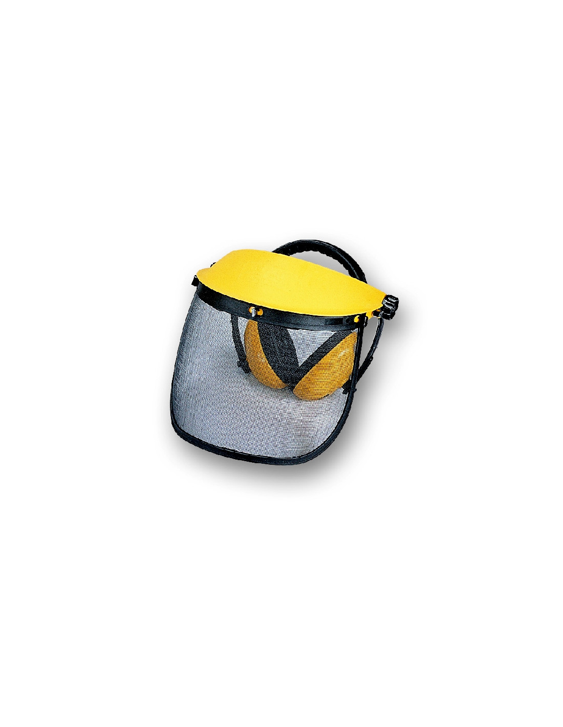Visière grillagée et coquilles antibruit jaunes en serre-tête.