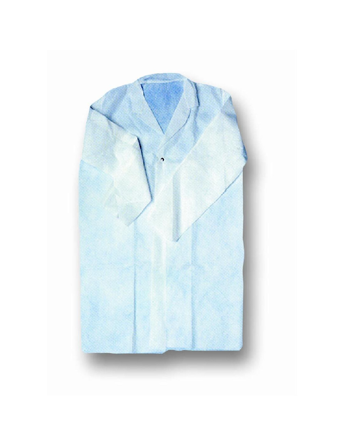 Cette Blouse jetable en PLP blanche est dotée de bouton pression, favorissant la fermeture de l’équipement professionnel