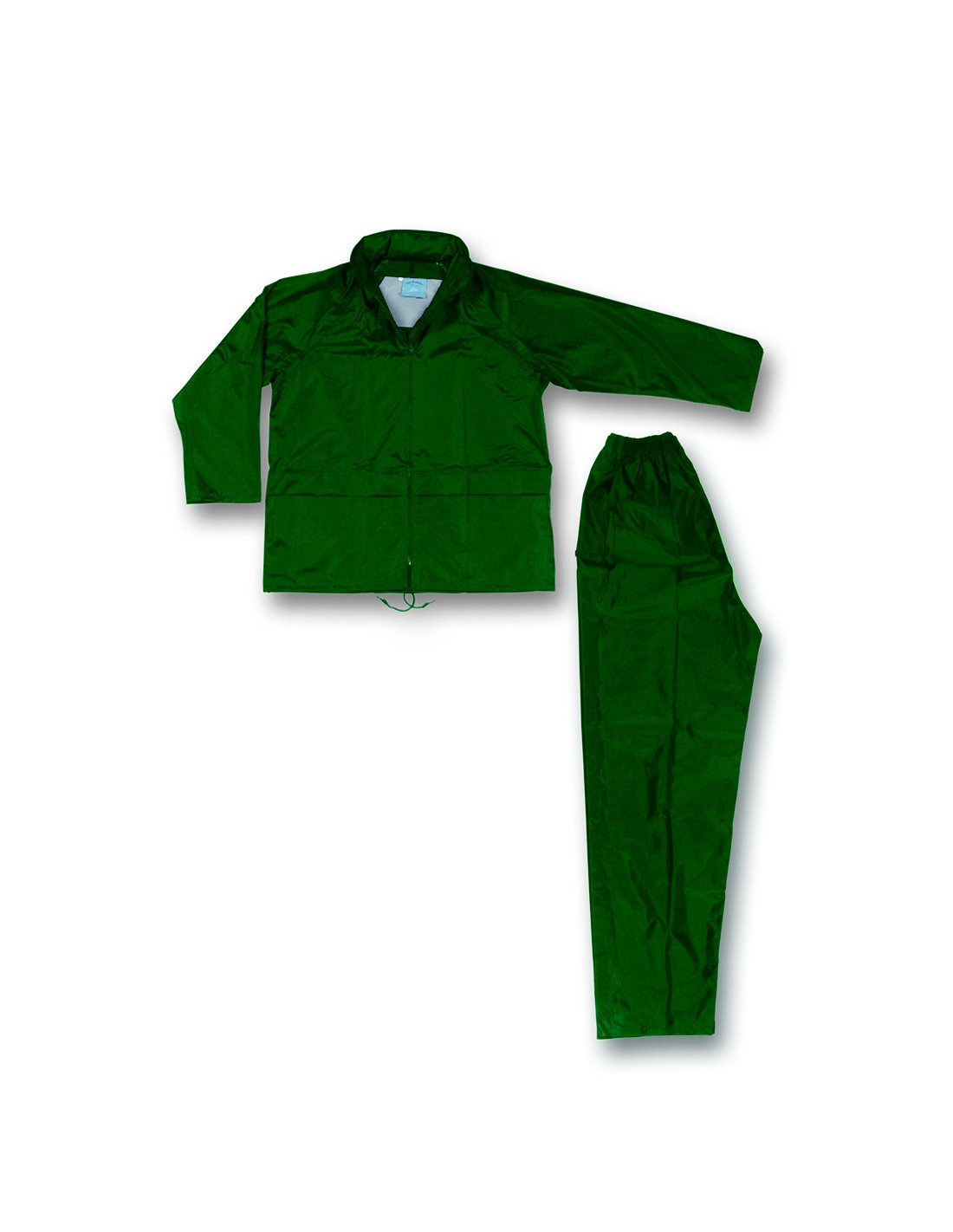 Veste et pantalon imperméables en nylon/pvc vert avec poche porte-badge transparente. La capuche est amovible et le pantalon dispose de deux poches latérales et de boutons-pression aux chevilles. Conforme à la norme EN 340, l’épaisseur du matériau est de 0,16 mm.